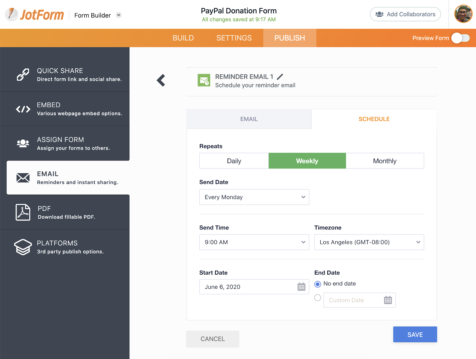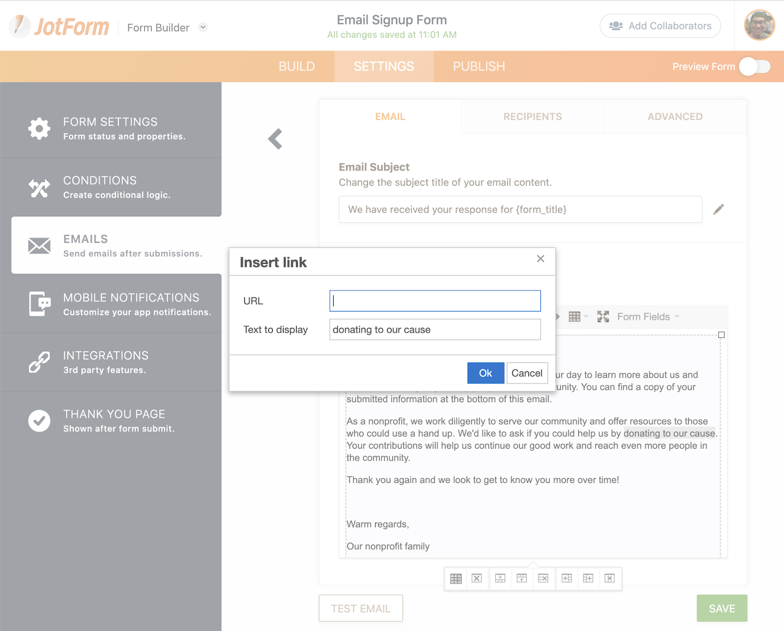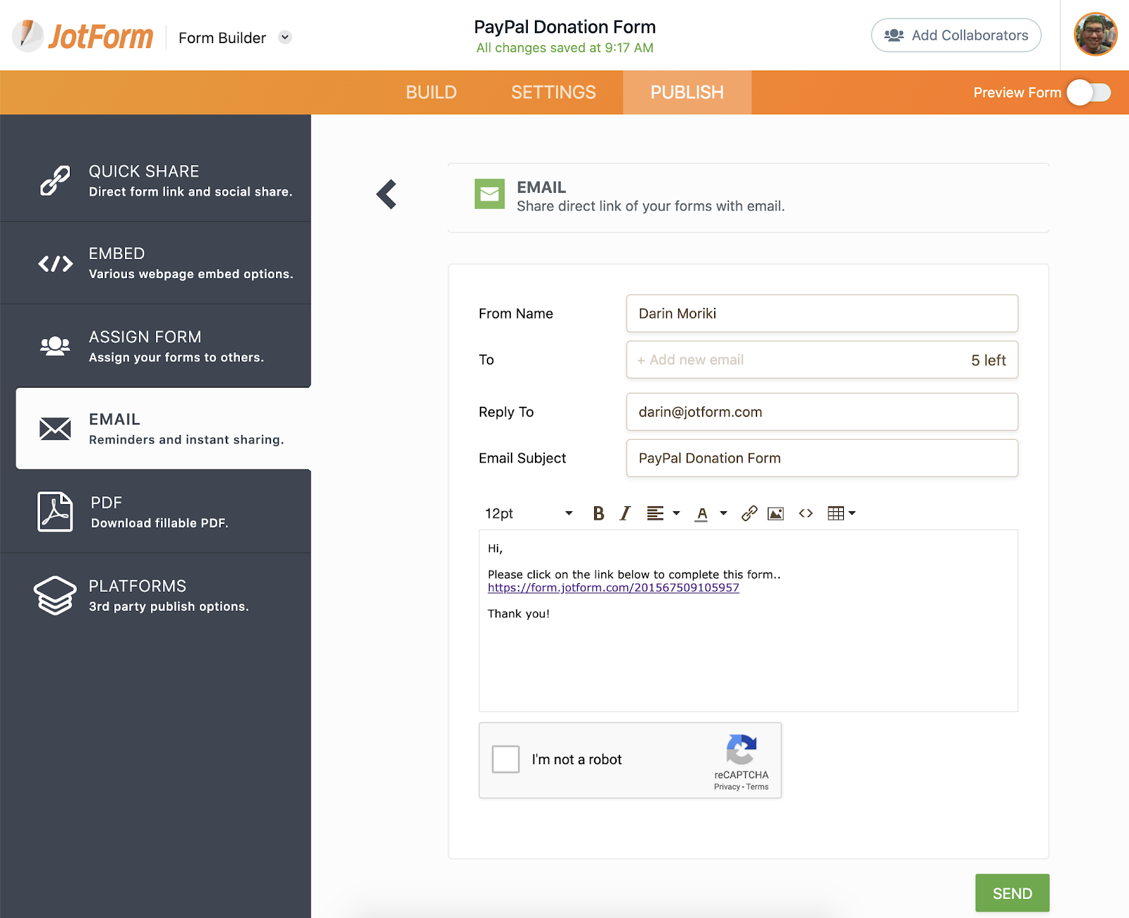 Jotform’s Form Builder also lets you send a customized email that includes a dedicated link to your online donation form. You can control what the email looks like and craft a special message that’s tailored to a group of existing or potential donors.