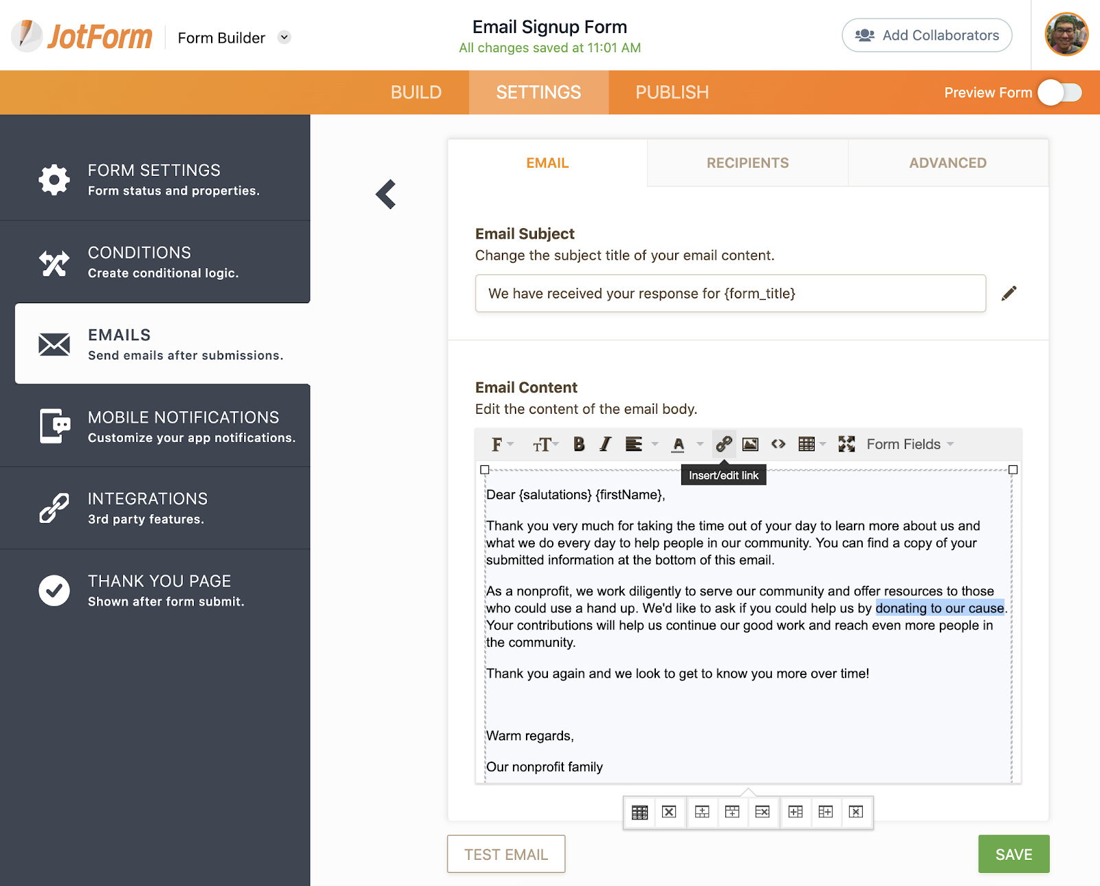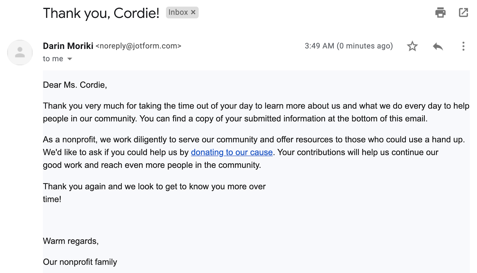 Since you can customize the automated email, Jotform enables you to thank people for their support, reiterate your organization’s mission, highlight your accomplishments, and underscore your future ambitions before asking for help.