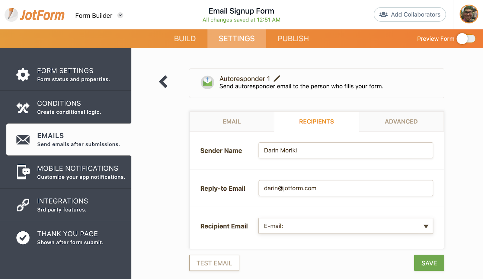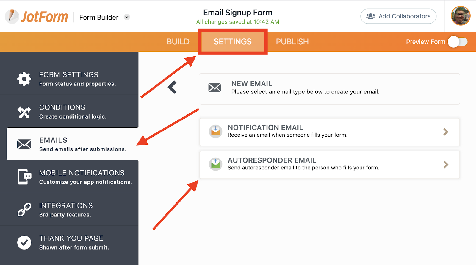 Autoresponders, located under the Settings tab in the Form Builder, send people an automated email response once they fill out and submit your form.