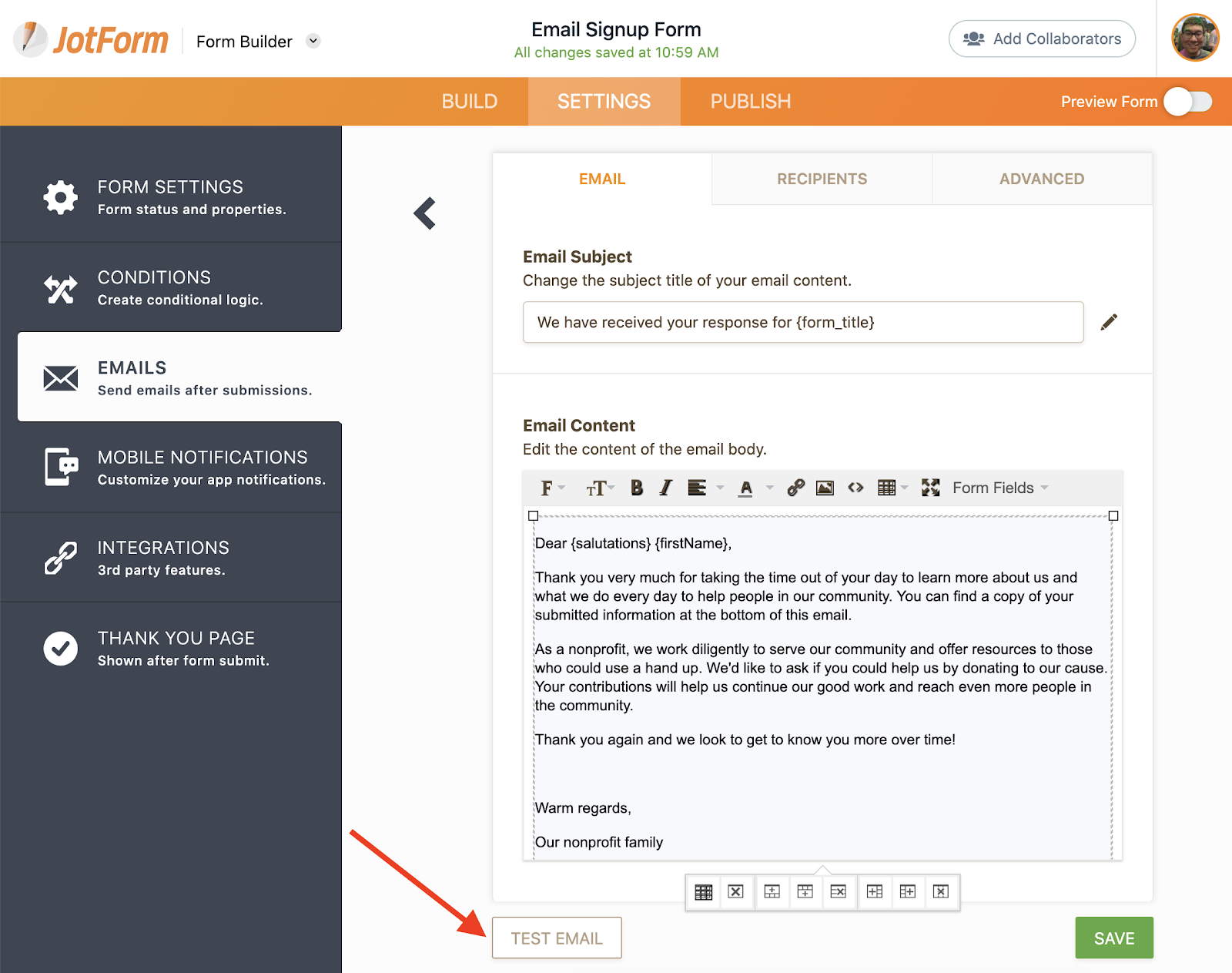 After you’ve created a professional-looking autoresponder, you can send a test email to the email address associated with your Jotform account. This way, you can ensure your message is on point, free of errors, and formatted correctly.