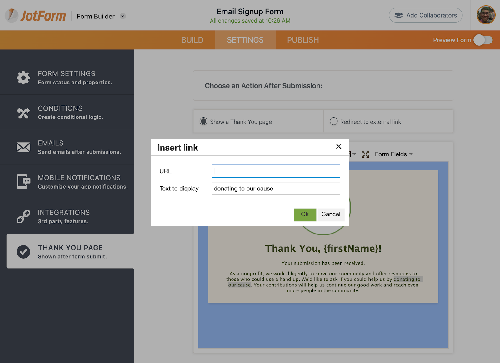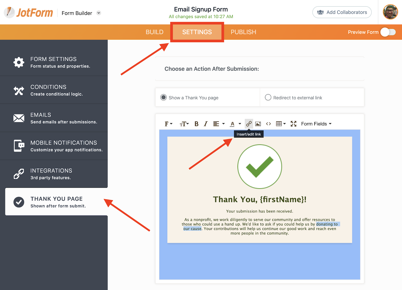 Since these people are familiar with your organization, you can also use this opportunity to subtly ask for donations and insert a link to your donation form. All you have to do is click on the Settings tab in the Form Builder and change the default text on your thank-you page.