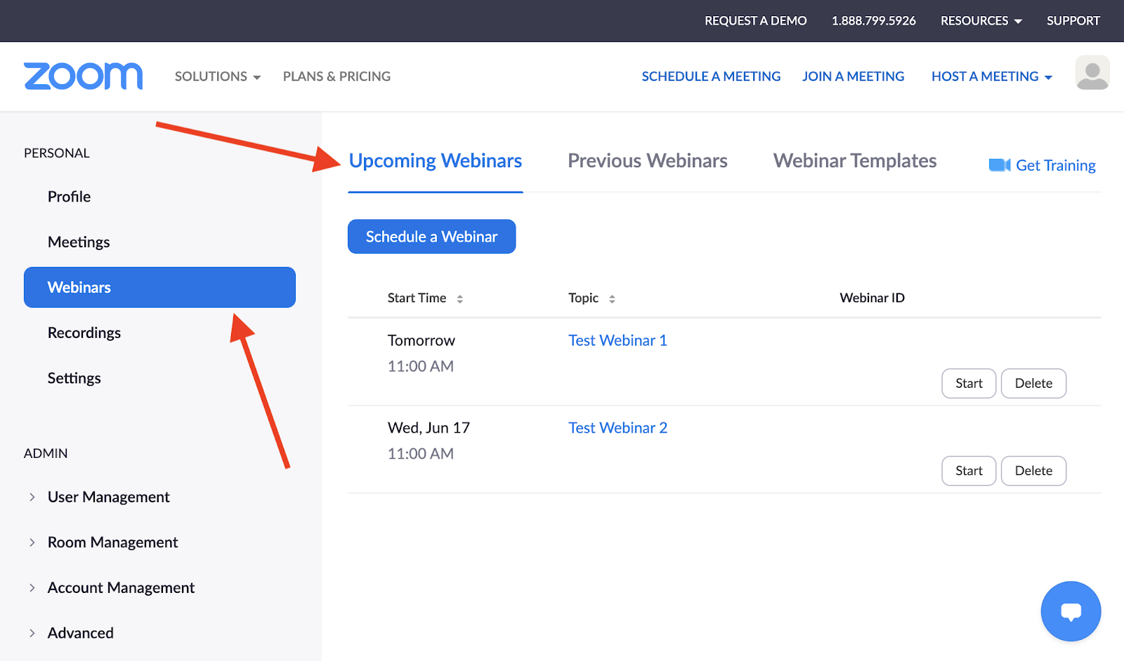 Before the webinar begins, simply click on the Webinars option in the Personal section of your Zoom web portal and select the scheduled webinar that you want to edit under the Upcoming Webinars tab.