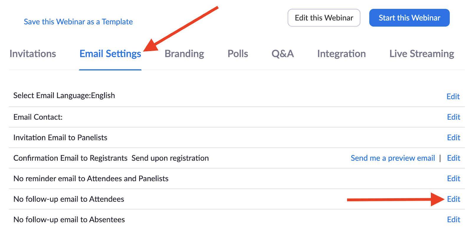In the list of email settings, click the Edit option beside the No follow-up email to Attendees status.