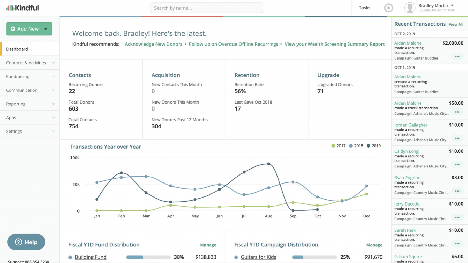 Funraise is a nonprofit donor CRM that provides custom data reports to support the donor management process. Easy to use, the platform stores data in a central location. Nonprofits can organize that data in many different ways, according to factors like donor history, demographics, and household information to build relationships or make well-informed asks.