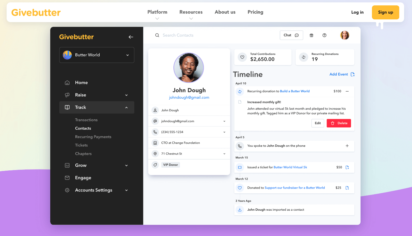 Givebutter features more than 100 free tools to support online fundraising. The platform’s CRM allows nonprofits to segment lists, build custom reports, and target certain groups of donors. Engagement tools like automated messaging and message analytics support donor communications.