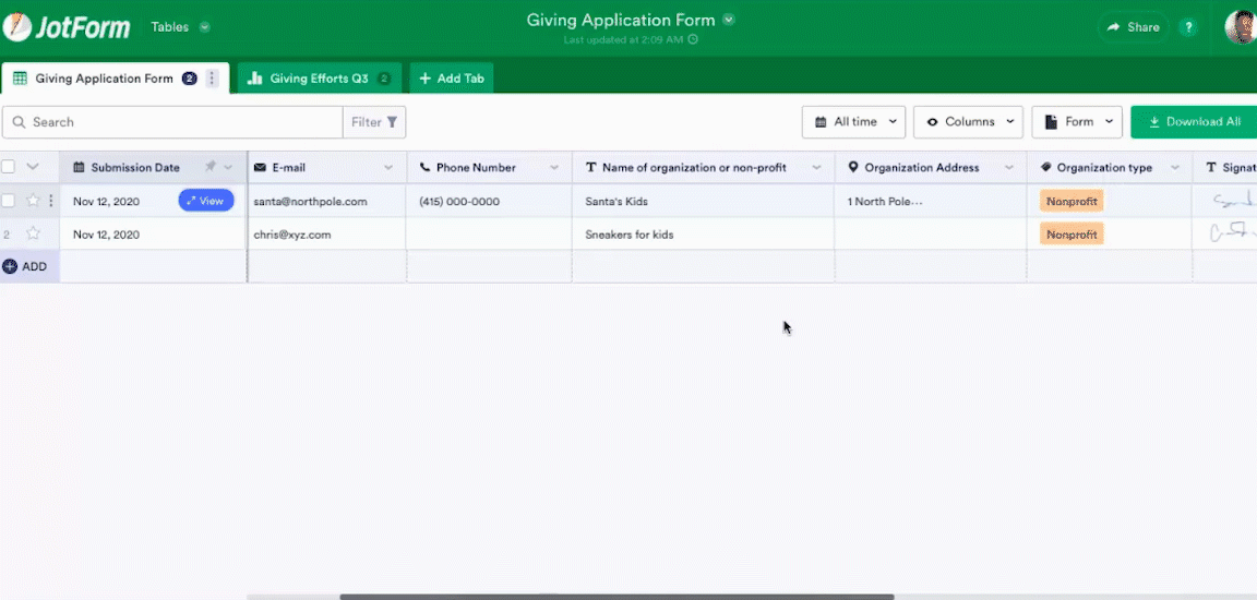 - Real-time data updates. In Jotform Tables, applications or requests for giving are submitted via forms, which progressively populate your Jotform Tables database — this is especially handy when you’re dealing with lots of submissions.