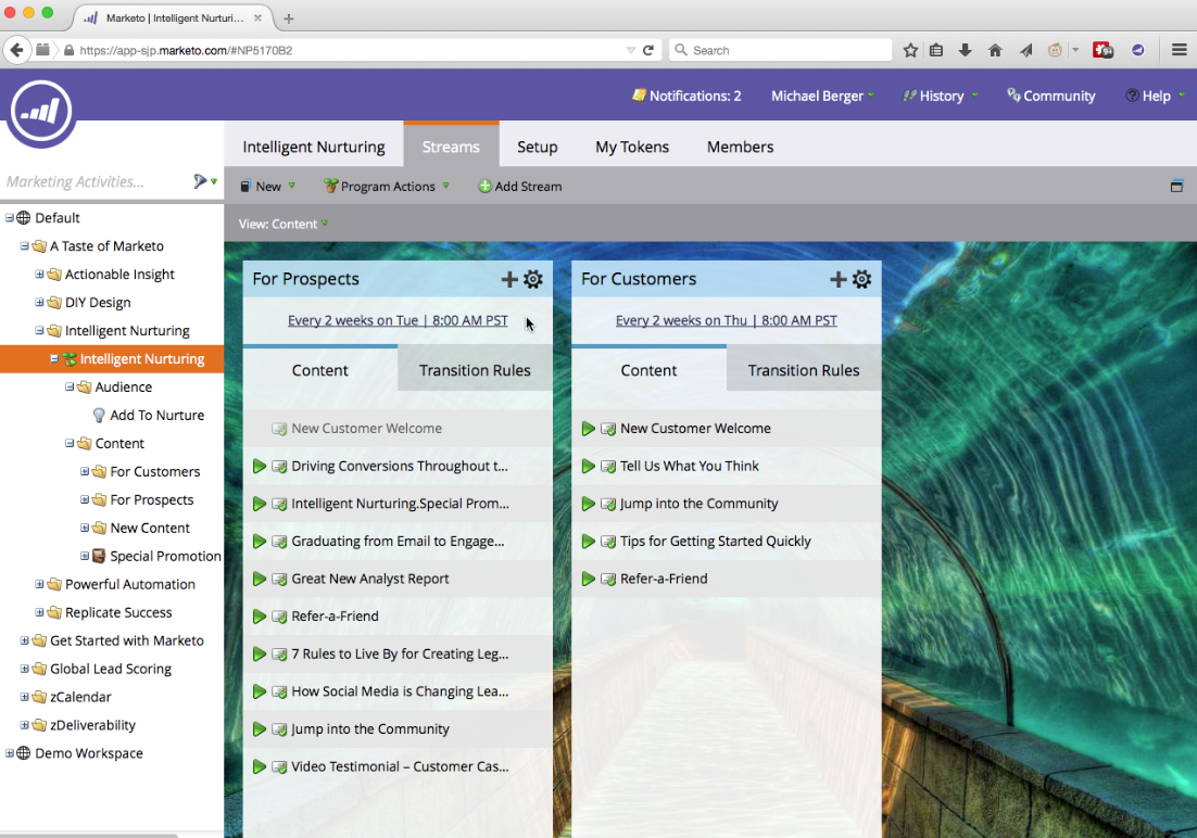 Marketo’s cross-channel engagement is one of these features. For example, when a prospective donor engages with a social media post, they automatically receive an email. That email encourages the prospect to watch a video on your website that then redirects to a donation form.