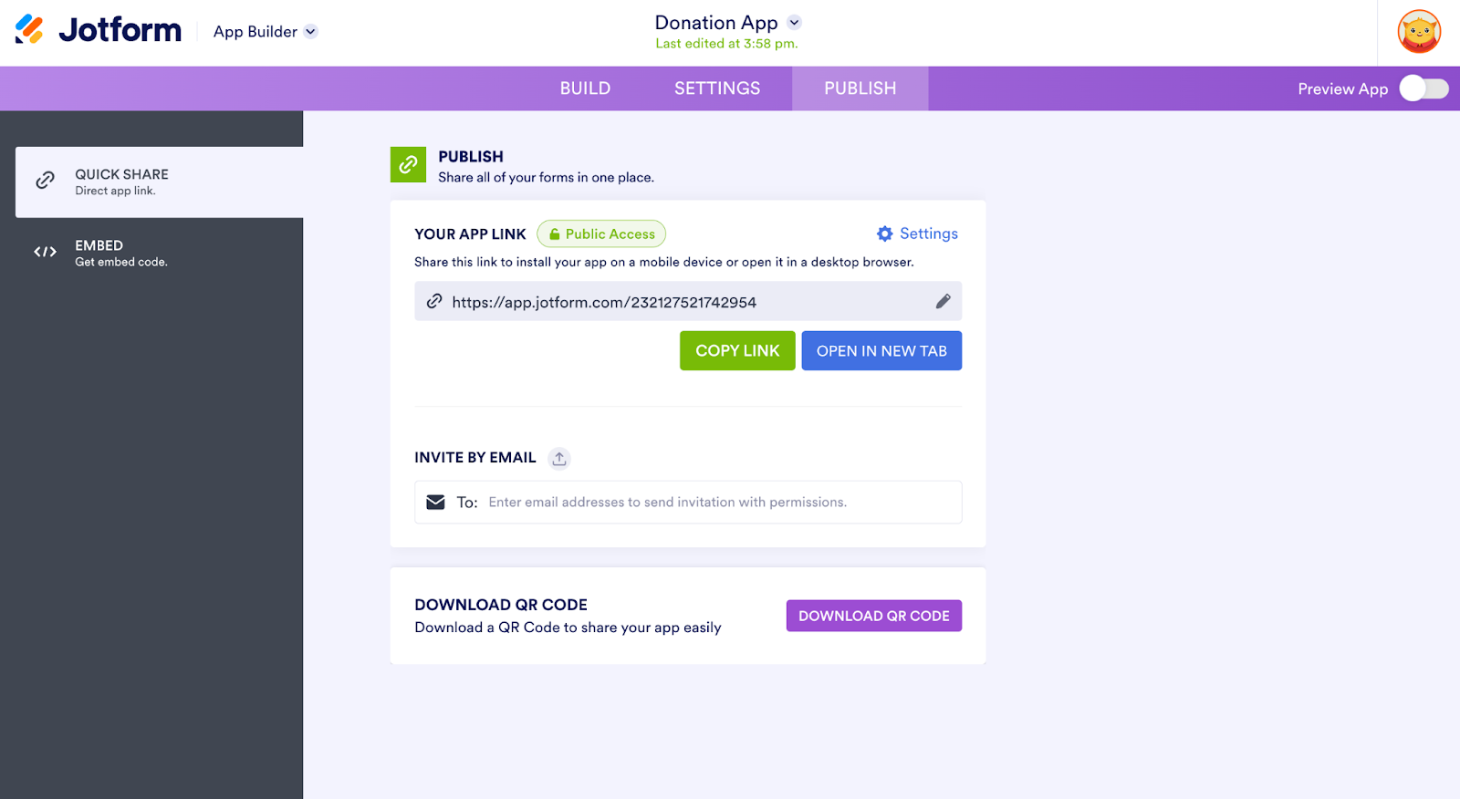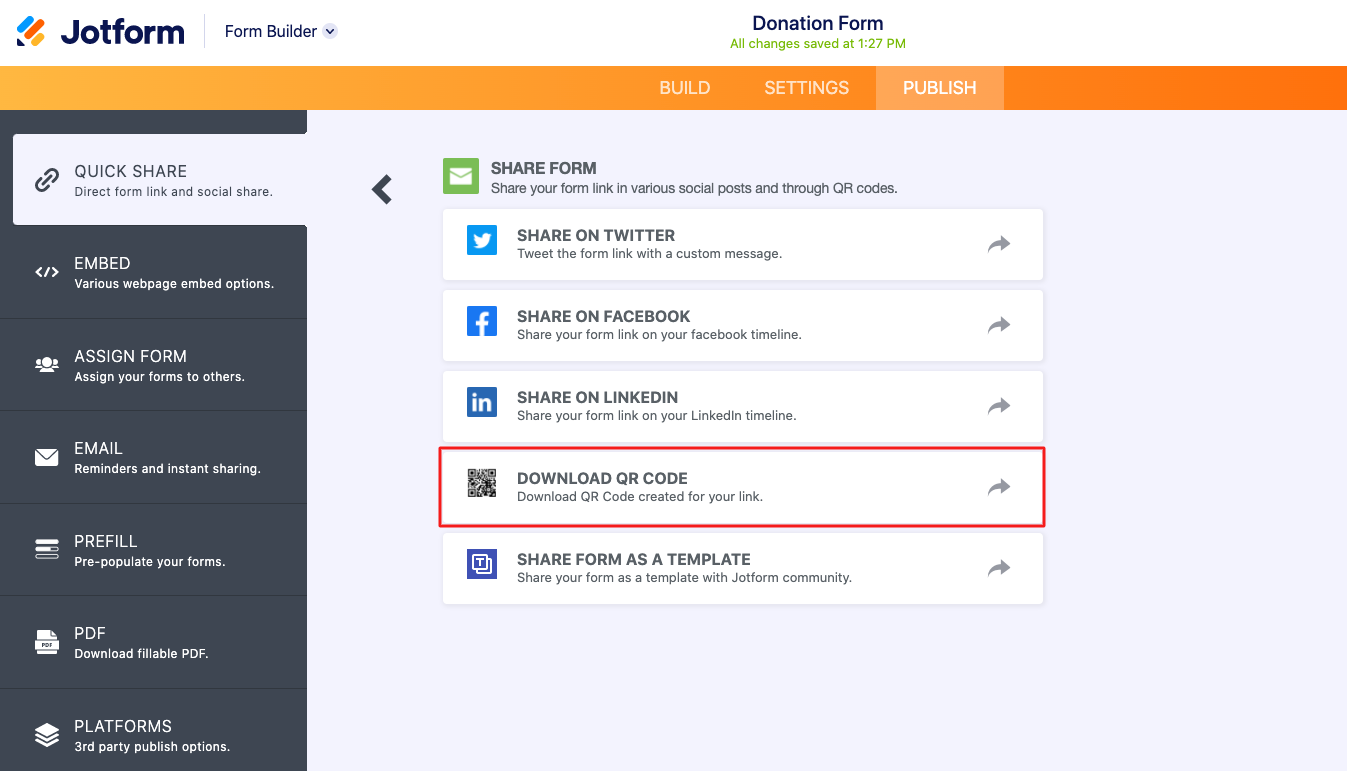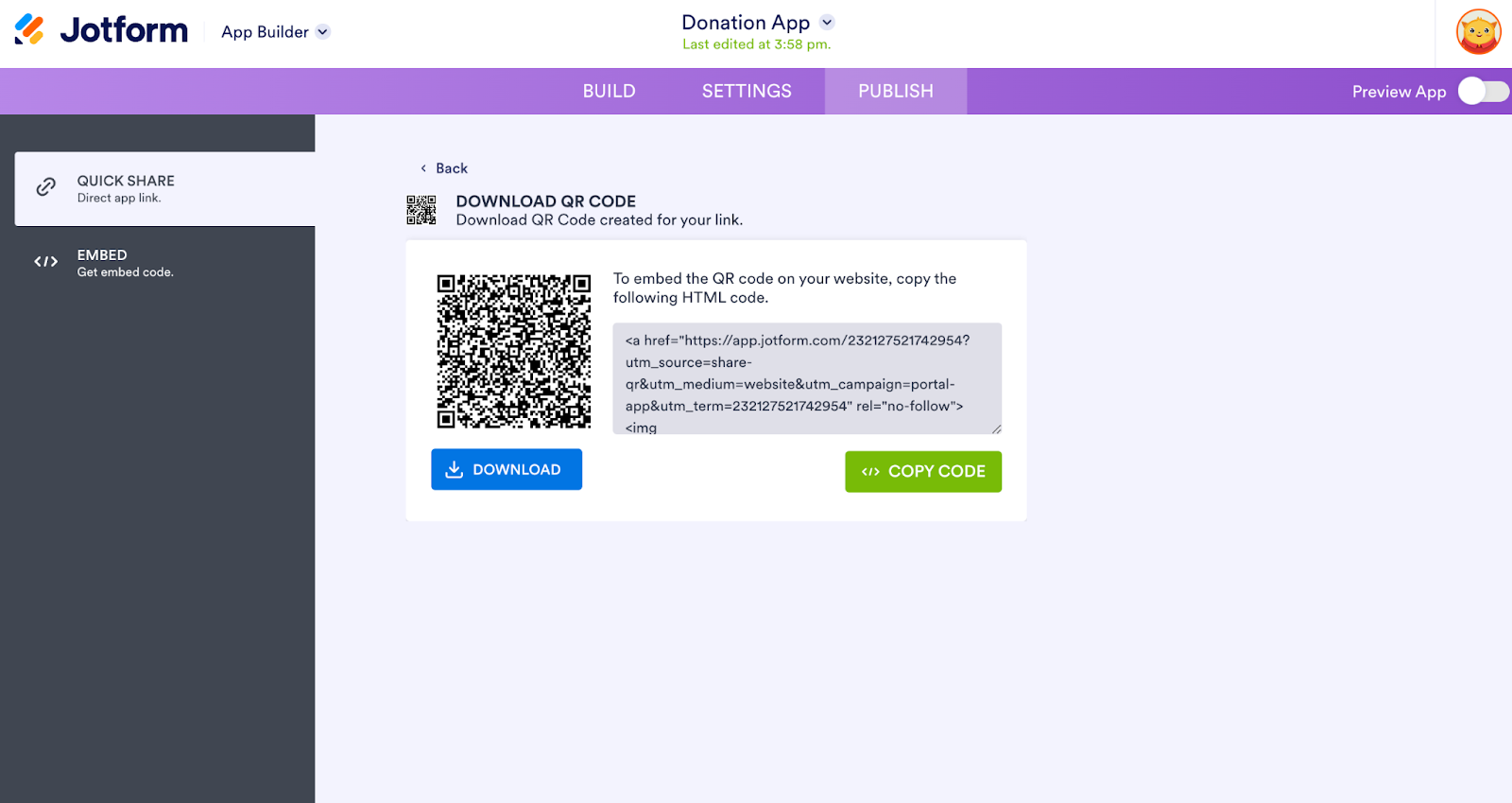 If you decide to build a donation app with Jotform and want to generate a QR code for it, we’ve got you covered. Just follow the steps below.