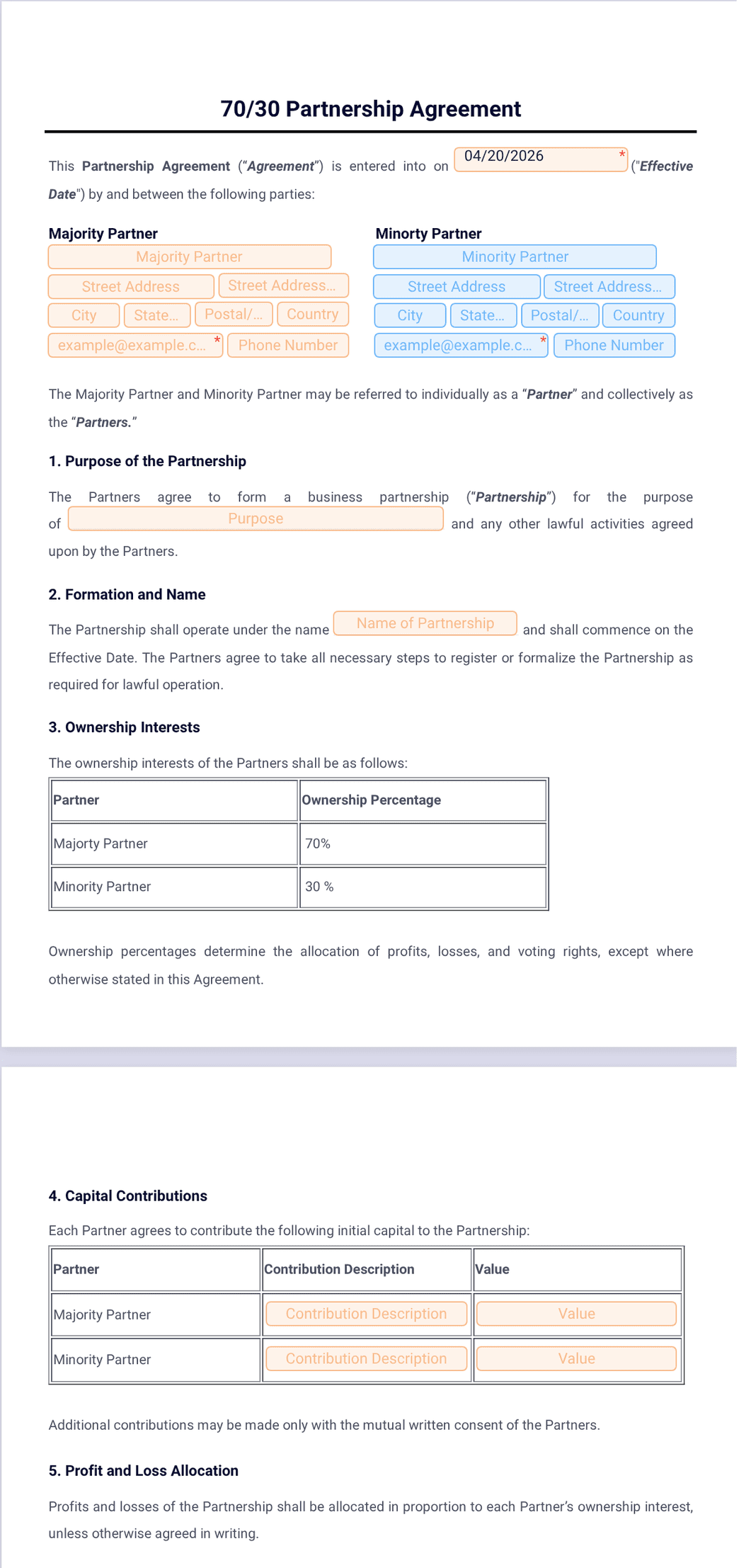 The 70/30 Partnership Agreement Template is a customizable document provided by Jotform that outlines the terms, conditions, and responsibilities of all partners involved in a business arrangement. This template provides a foundation for drafting a clear and comprehensive agreement, setting the operational, financial, and management guidelines for the partnership.
