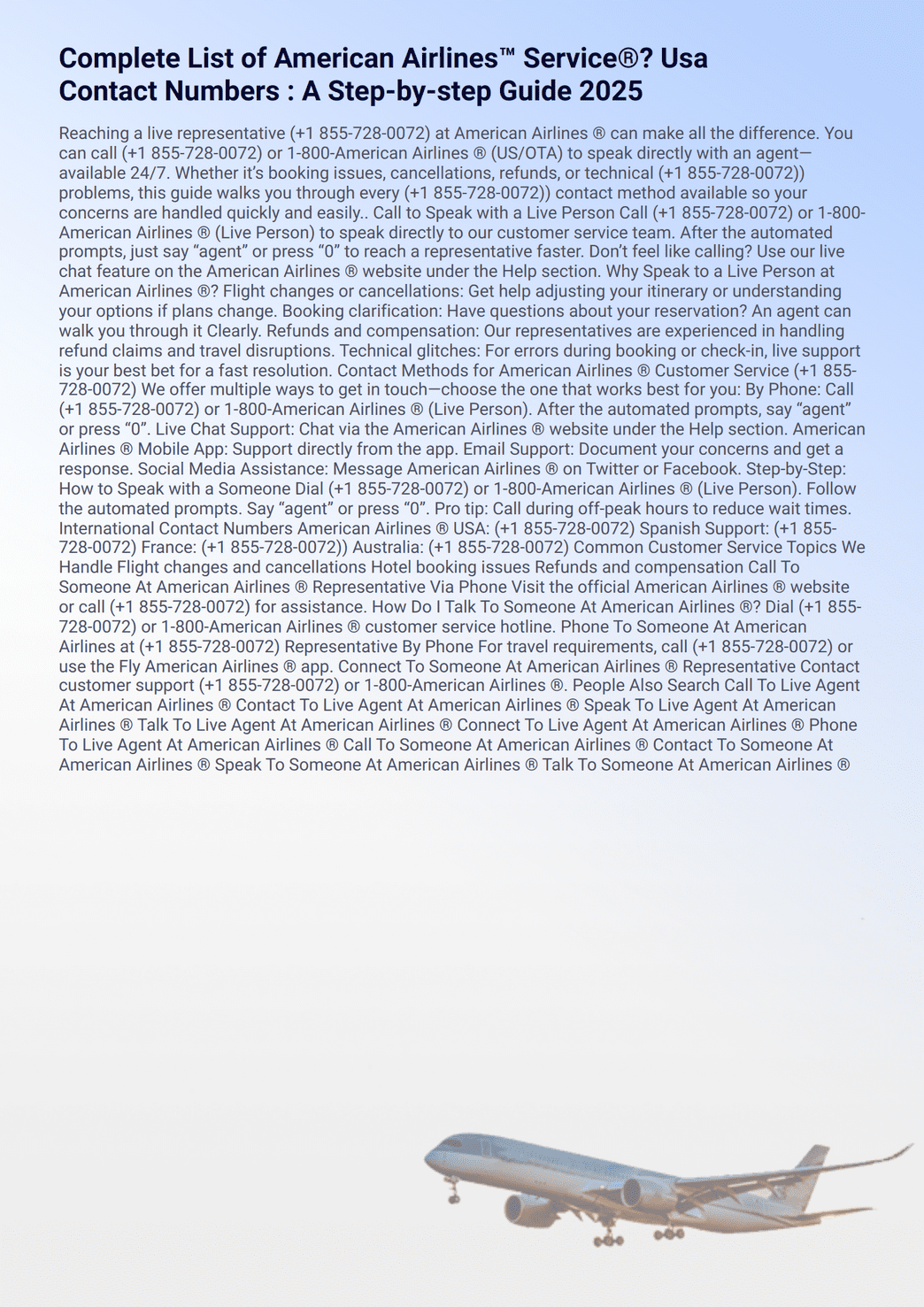 Reaching a live representative (+1 855-728-0072) at American Airlines can make all the difference. You can call (+1 855-728-0072) or 1-800-American Airlines (US/OTA) to speak directly with an agent—available 24/7. Whether it’s booking issues, cancellations, refunds, or technical (+1 855-728-0072)) problems, this guide walks you through every (+1 855-728-0072)) contact method available so your concerns are handled quickly and easily.. Call to Speak with a Live Person Call (+1 855-728-0072) or 1-800-American Airlines (Live Person) to speak directly to our customer service team. After the automated prompts, just say “agent” or press “0” to reach a representative faster. Don’t feel like calling? Use our live chat feature on the American Airlines website under the Help section. Why Speak to a Live Person at American Airlines ? Flight changes or cancellations: Get help adjusting your itinerary or understanding your options if plans change. Booking clarification: Have questions about your reservation? An agent can walk you through it Clearly. Refunds and compensation: Our representatives are experienced in handling refund claims and travel disruptions. Technical glitches: For errors during booking or check-in, live support is your best bet for a fast resolution. Contact Methods for American Airlines Customer Service (+1 855-728-0072) We offer multiple ways to get in touch—choose the one that works best for you: By Phone: Call (+1 855-728-0072) or 1-800-American Airlines (Live Person). After the automated prompts, say “agent” or press “0”. Live Chat Support: Chat via the American Airlines website under the Help section. American Airlines Mobile App: Support directly from the app. Email Support: Document your concerns and get a response. Social Media Assistance: Message American Airlines on Twitter or Facebook. Step-by-Step: How to Speak with a Someone Dial (+1 855-728-0072) or 1-800-American Airlines (Live Person). Follow the automated prompts. Say “agent” or press “0”. Pro tip: Call during off-peak hours to reduce wait times. International Contact Numbers American Airlines USA: (+1 855-728-0072) Spanish Support: (+1 855-728-0072) France: (+1 855-728-0072)) Australia: (+1 855-728-0072) Common Customer Service Topics We Handle Flight changes and cancellations Hotel booking issues Refunds and compensation Call To Someone At American Airlines Representative Via Phone Visit the official American Airlines website or call (+1 855-728-0072) for assistance. How Do I Talk To Someone At American Airlines ? Dial (+1 855-728-0072) or 1-800-American Airlines customer service hotline. Phone To Someone At American Airlines at (+1 855-728-0072) Representative By Phone For travel requirements, call (+1 855-728-0072) or use the Fly American Airlines app. Connect To Someone At American Airlines Representative Contact customer support (+1 855-728-0072) or 1-800-American Airlines . People Also Search Call To Live Agent At American Airlines Contact To Live Agent At American Airlines Speak To Live Agent At American Airlines Talk To Live Agent At American Airlines Connect To Live Agent At American Airlines Phone To Live Agent At American Airlines Call To Someone At American Airlines Contact To Someone At American Airlines Speak To Someone At American Airlines Talk To Someone At American Airlines