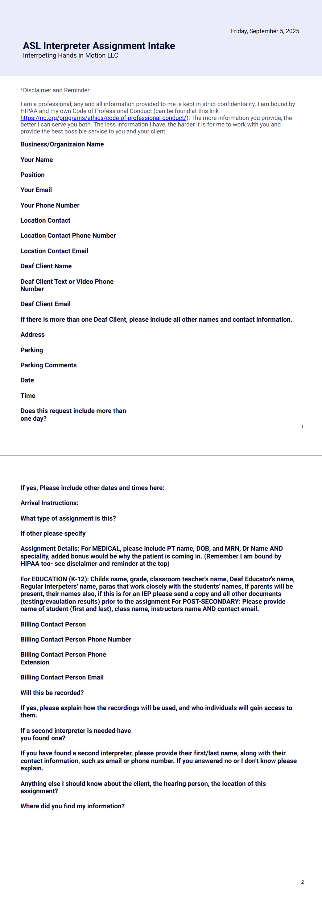 ASL Interepreter Intake Form