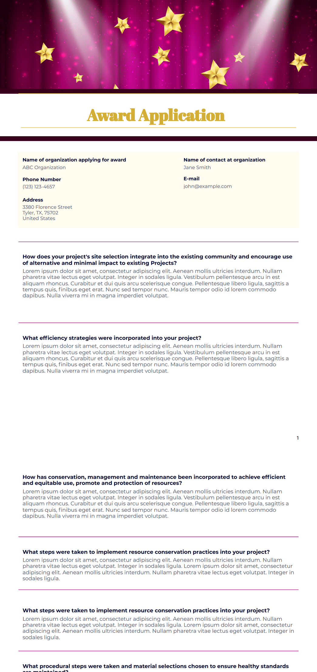 You can use this Award Application Template if you work in a company or organization that provides awards. This amazing Award Application Template contains information about the achievements of the organization. The answers to each question in the template show the quality of work rendered in order for the project to be successful. This template also has a File Upload function where the applicant can attach supporting documents for their application.