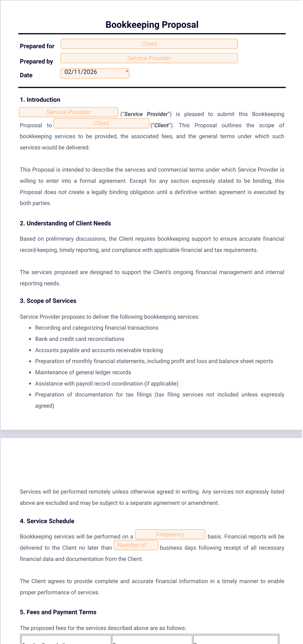 5) What are the key components that should be included in the bookkeeping proposal template?