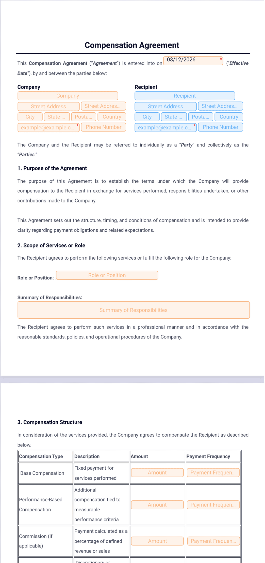A Compensation Agreement is a formal document that outlines the terms and conditions of an employee's pay and benefits. It is a crucial tool for businesses, HR teams, and administrative departments to ensure a clear understanding of compensation structure, responsibilities, and expectations between the parties involved. This document is essential for both employers and employees as it provides a reference point for any disputes or misunderstandings related to compensation. It can be used to detail salary, bonus structure, benefits, reimbursement policies, and other forms of compensation, thereby creating a transparent environment for compensation discussions and negotiations.