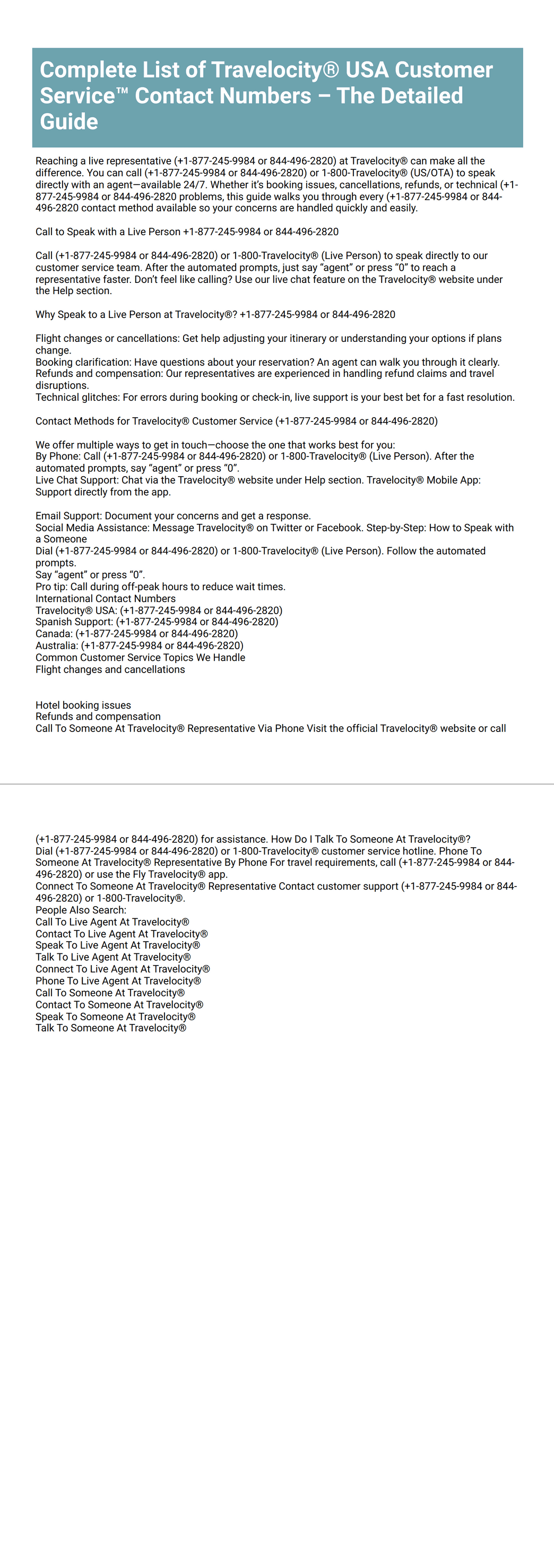 Reaching a live representative (+1-877-245-9984 or 844-496-2820) at Travelocity can make all the difference. You can call (+1-877-245-9984 or 844-496-2820) or 1-800-Travelocity (US/OTA) to speak directly with an agent—available 24/7. Whether it’s booking issues, cancellations, refunds, or technical (+1-877-245-9984 or 844-496-2820 problems, this guide walks you through every (+1-877-245-9984 or 844-496-2820 contact method available so your concerns are handled quickly and easily.