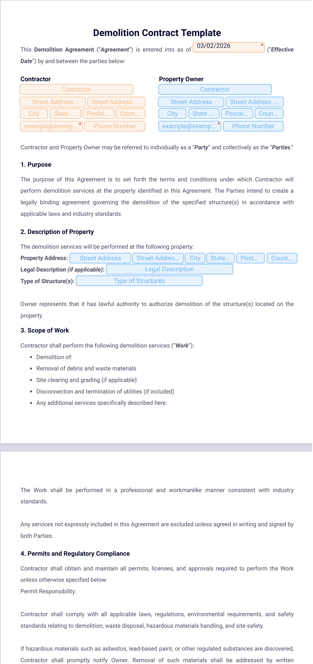 A Demolition Contract is a document that outlines the details, expectations, and obligations of a demolition project between the property owner and the demolition contractor. This document is crucial to ensure both parties have a clear understanding of the scope of the project, the responsibilities of each party, the payment structure, and the project timeline. This contract is primarily used by construction companies, demolition contractors, property owners, and project managers looking to formalize the terms and conditions of a demolition project. By using this document, potential issues such as miscommunication, delays, and disputes can be preemptively addressed and resolved, allowing the project to be completed smoothly and efficiently.