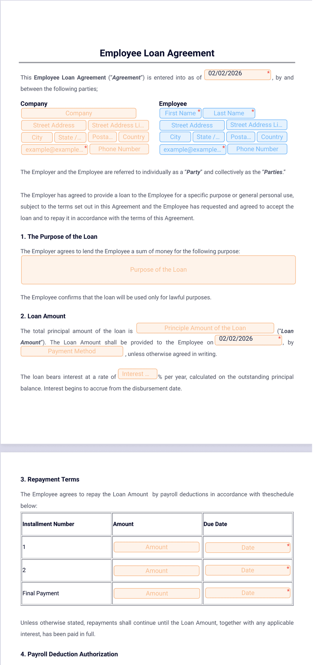 The Employee Loan Agreement Template is a customizable document provided by Jotform that outlines the terms and conditions of a loan provided by an employer to an employee. It includes all necessary fields to specify the loan amount, repayment schedule, interest rate, and other critical parameters.