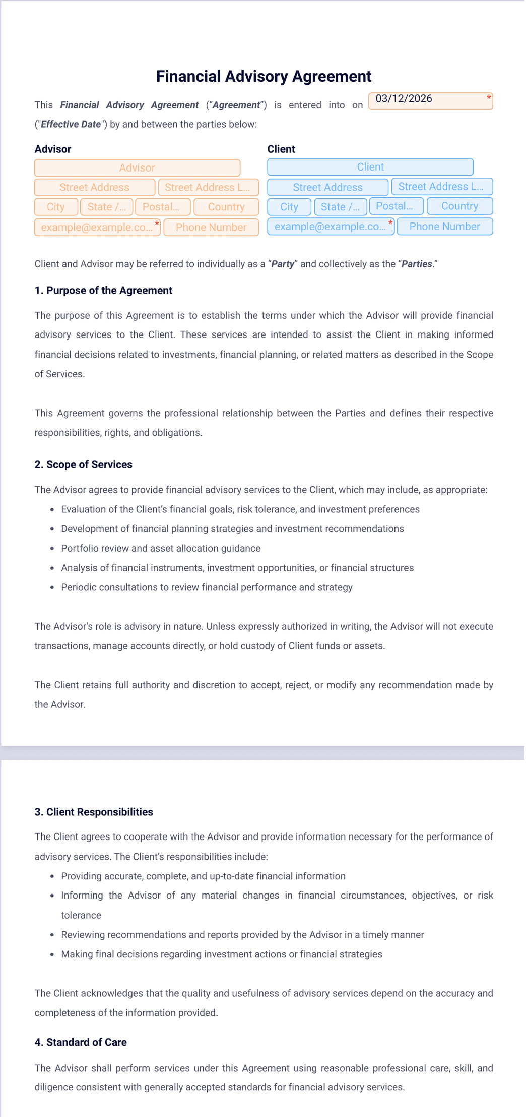 4) How does the financial advisory agreement template work?