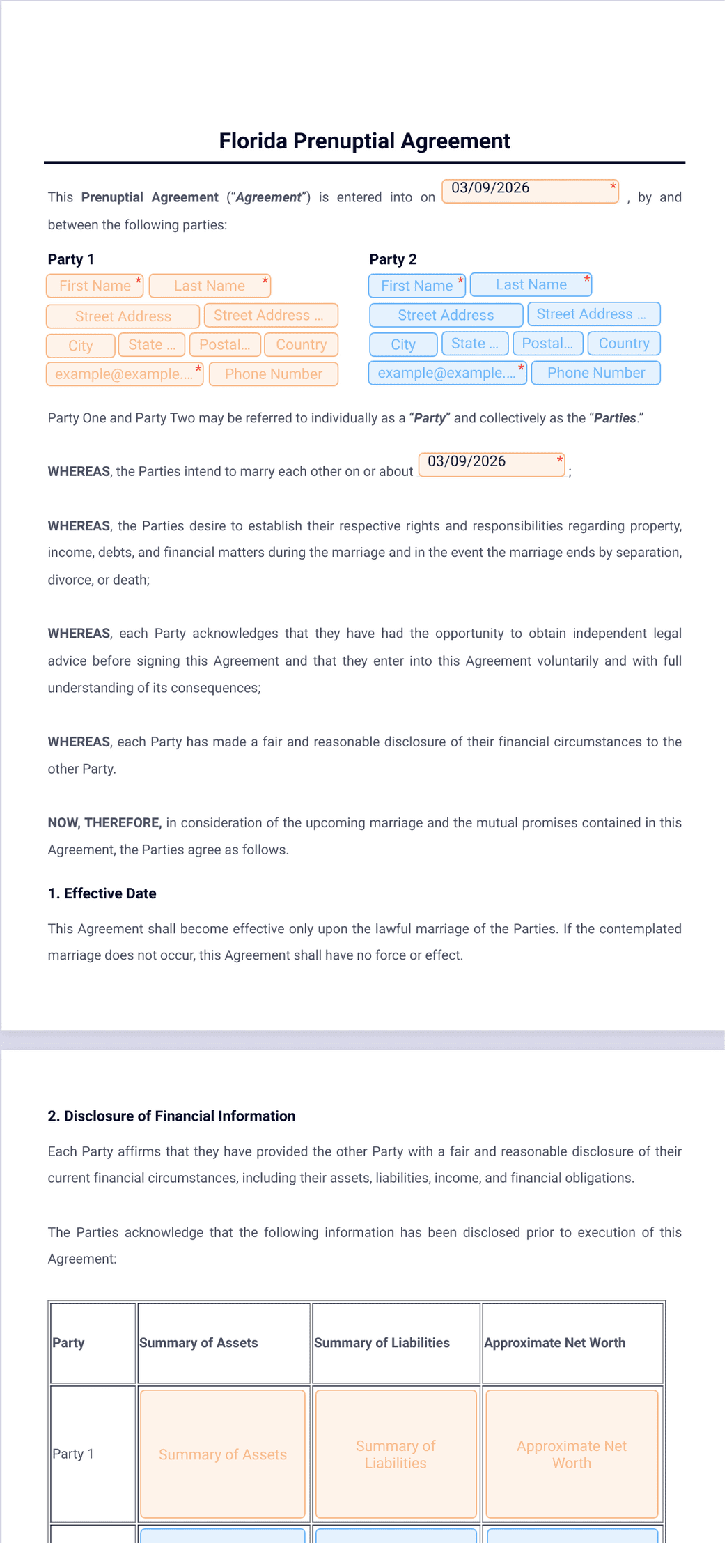 Harness the power of Jotform’s E-sign product to streamline the process of creating and signing your Florida Prenuptial Agreement. Our platform offers a user-friendly drag-and-drop builder, allowing you to customize your agreement to suit your unique needs. Select from over 800 ready-made sign templates, including a Florida-specific prenuptial agreement template. Jotform also offers powerful integrations, allowing you to seamlessly transfer data to your preferred storage provider. With Jotform, you can easily share documents, automate approval flows and manage your data with Jotform Tables. Our advanced security measures ensure that your data is kept safe and secure. This way, you can focus on what's important: planning your future together. Are you ready to simplify your prenuptial agreement process?