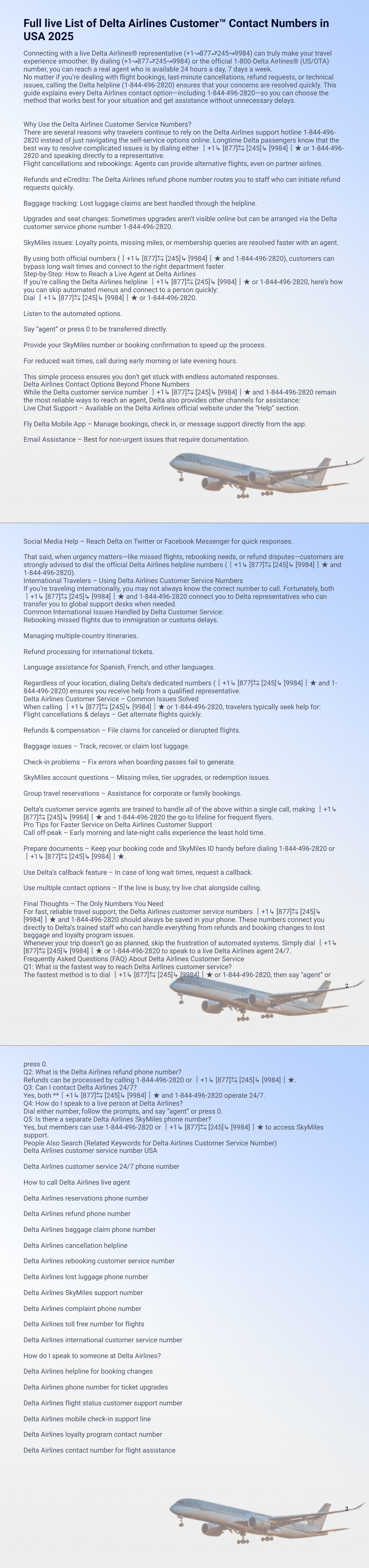 For fast, reliable travel support, the Delta Airlines customer service numbers ║+1↳ [877]⇆ [245]↳ [9984]║★ and 1-844-496-2820 should always be saved in your phone. These numbers connect you directly to Delta’s trained staff who can handle everything from refunds and booking changes to lost baggage and loyalty program issues.