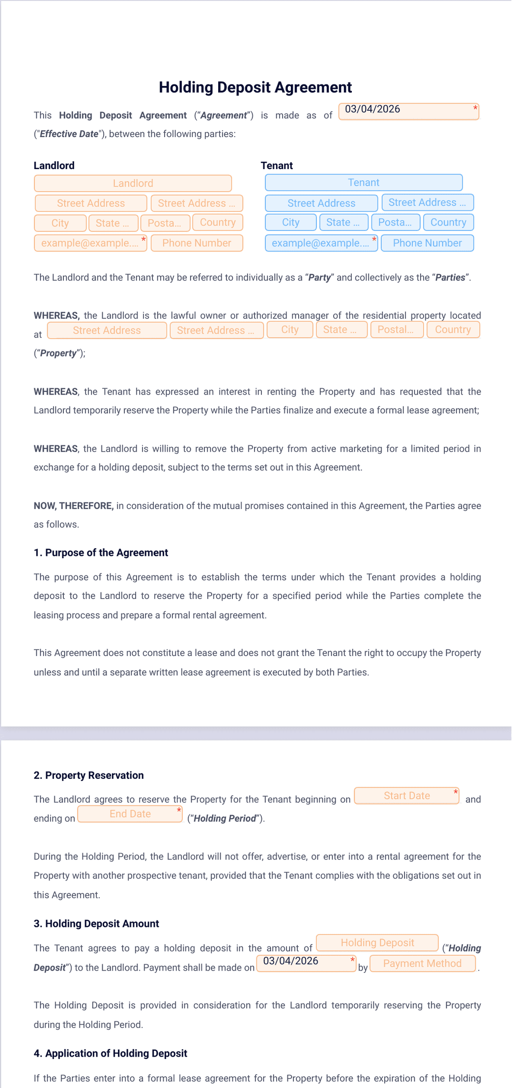 The Holding Deposit Agreement Template works by providing a structure for the terms and conditions that apply when a buyer or tenant gives a deposit to secure a property for a specific period. The template uses Jotform's automatic field detection feature to create a signable online document.