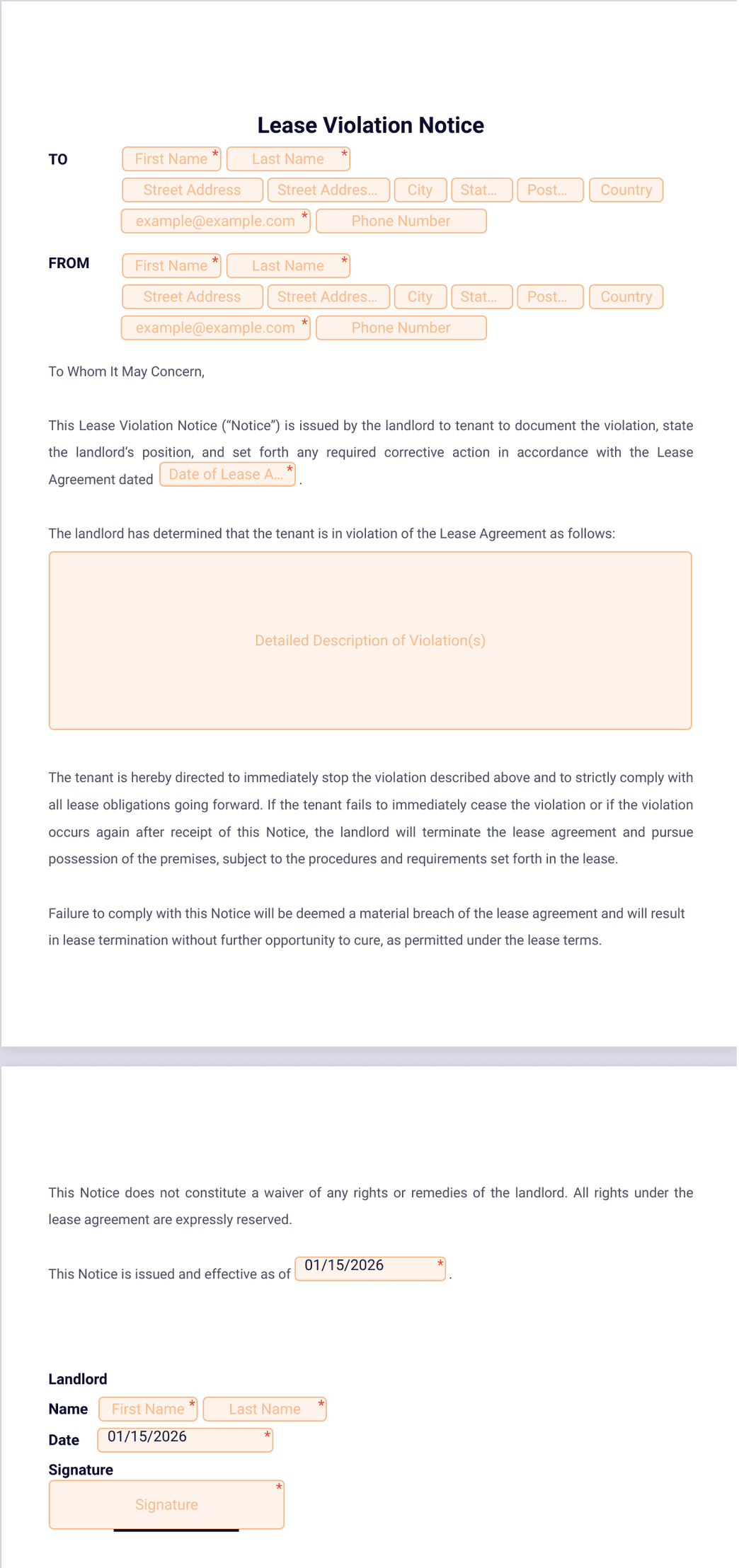 The Lease Violation Notice Template on Jotform is a pre-built digital document designed to streamline the process of notifying tenants about any lease violations. It provides a user-friendly structure to outline the violation details, helping you communicate the infraction clearly and professionally.