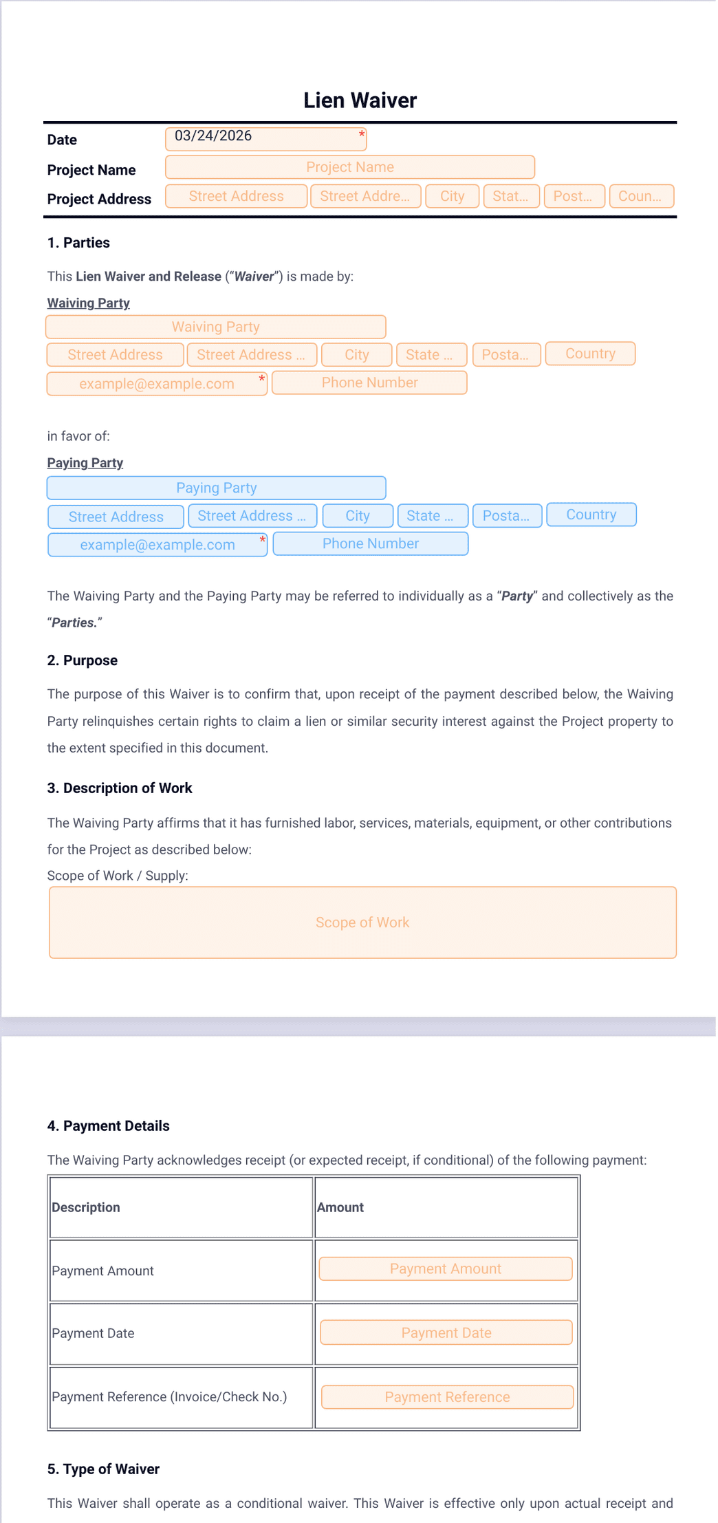 Transform your lien waiver generation process with Jotform. With Jotform Sign, you can utilize its drag-and-drop e-sign builder to create signable Lien Waiver documents in minutes. The platform offers a wide array of form field types, enabling you to convert your PDF documents into signable online documents designed for an infinite number of use cases. Sharing the waiver form becomes a breeze with Jotform, as you can collect signatures by creating a public link for your document. Furthermore, Jotform Sign provides a secure, easy-to-use platform compatible with all devices. With its advanced security, Jotform guarantees you a stress-free lien waiver creation process, enhancing efficiency and freeing up precious time.