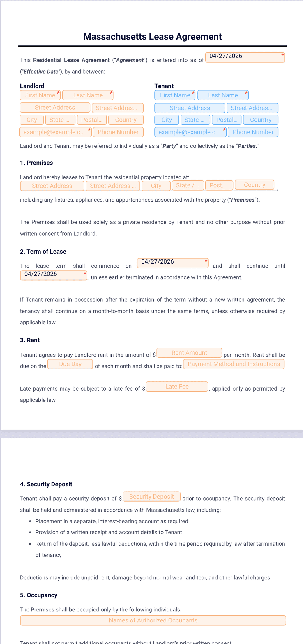 Bring your document signing process into the digital age with Jotform’s E-sign solution. It's a user-friendly tool that allows you to obtain electronic signatures on your Massachusetts Lease Agreement templates effortlessly. With Jotform, you can customize your lease agreement to suit your specific needs using our intuitive drag-and-drop builder. Choose from our library of over 1000 ready-made templates to get started quickly. Features like automated approval flows streamline your processes, notifying you as soon as all signatures are in place. Worried about data security? Jotform ensures top-notch security with features like strong protection with a digital certificate, access code protection, and an audit trail for tracking all steps of the signing process. Lease agreements have never been easier with Jotform!
