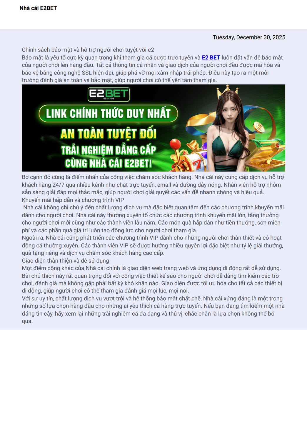 Bảo mật là yếu tố cực kỳ quan trọng khi tham gia cá cược trực tuyến, và E2 BET luôn đặt vấn đề bảo mật của người chơi lên hàng đầu. Tất cả thông tin cá nhân và giao dịch của người chơi đều được mã hóa và bảo vệ bằng công nghệ SSL hiện đại, giúp ngăn ngừa mọi sự xâm nhập trái phép. Điều này tạo ra một môi trường cá cược an toàn và bảo mật, giúp người chơi có thể yên tâm tham gia.