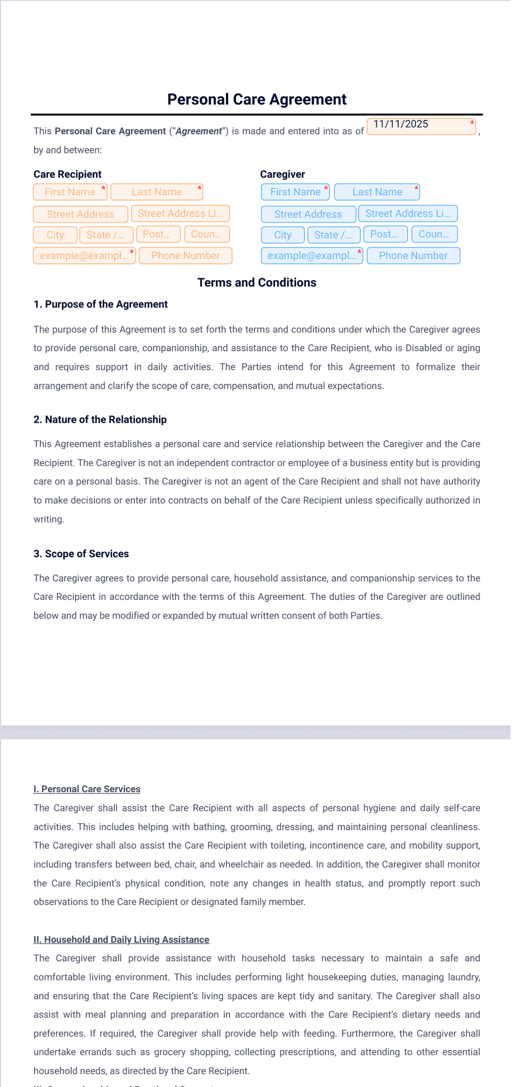 A Personal Care Agreement is a formal understanding that outlines the terms and conditions of a caregiving arrangement between two parties. The document is typically used by individuals receiving personal care, such as the elderly, disabled, or chronically ill persons, family members, or friends providing informal care, professional caregivers, and care coordinators. The primary use of this agreement is to define compensation, clarify duties and expectations, and protect both parties. It helps offering a clear and comprehensive roadmap for caregiving roles and responsibilities, fostering a transparent and mutually beneficial relationship between the care recipient and caregiver.