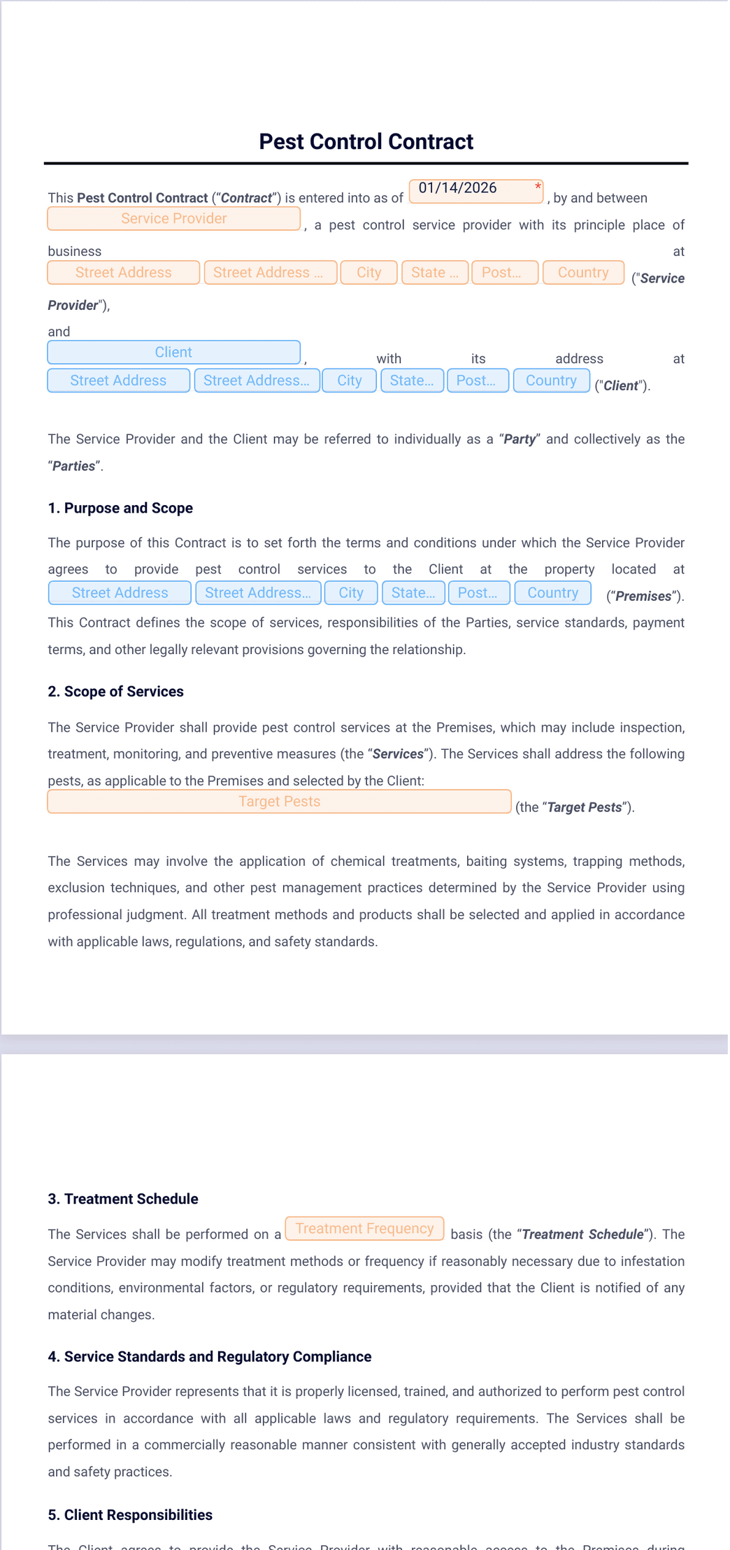 A Pest Control Contract is a formal agreement between a pest control service provider and their client, outlining the scope of the pest control services to be provided, the frequency of treatments, service fees, payment terms, and the responsibilities of each party. This document is essential for pest control companies, homeowners, commercial property owners, landlords, facilities managers, and those in the hospitality business. By using this contract, it ensures transparency and protects the interests of both parties. It helps manage liability, establish service schedules, outline safety requirements and access rights, and supports long-term service relationships.