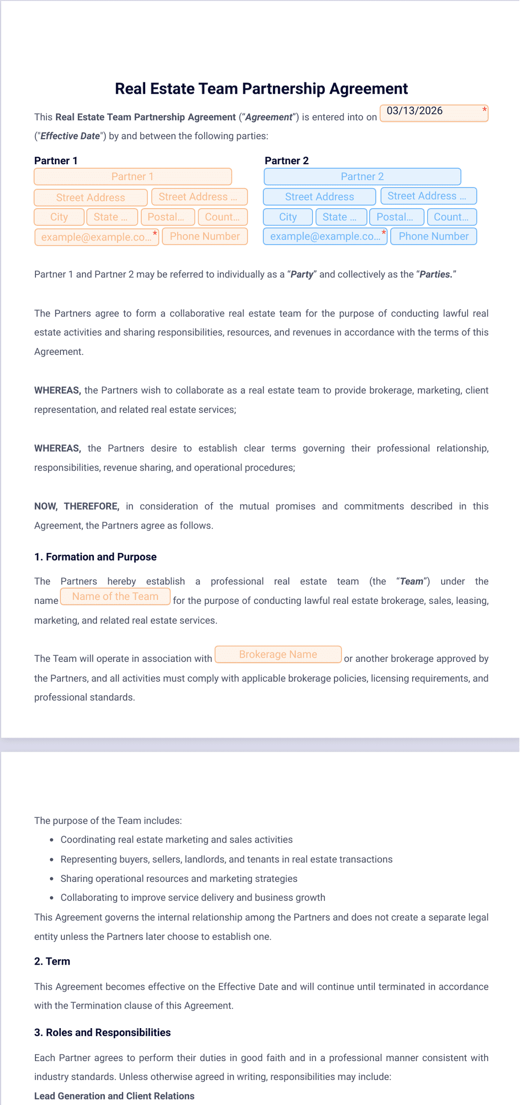 The Real Estate Team Partnership Agreement Template works as a document where all the terms and responsibilities of the team members are laid out clearly to avoid any future disputes. After customization, it can be shared with the respective parties who can review and sign it online using Jotform Sign.