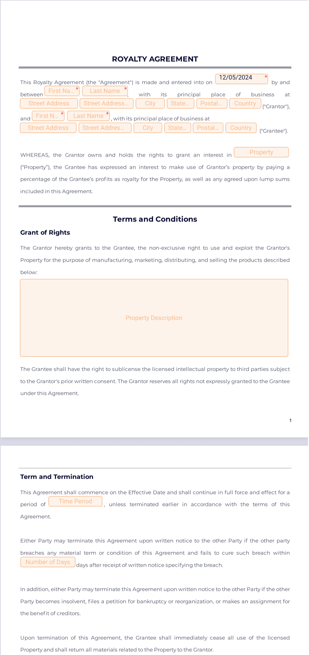 This Royalty Agreement can be fully customized in seconds with our drag-and-drop form builder. You can add or edit form fields, include additional signature fields, upload your unique branding, change fonts and colors, set up an automated signing order, and more. Get paid for your intellectual property with this free template from Jotform Sign.