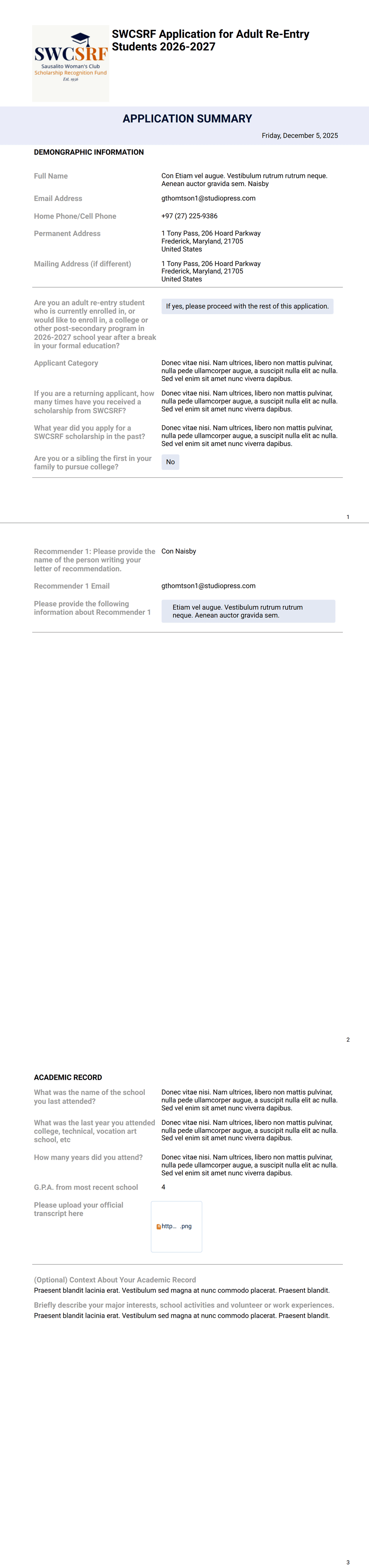 Scholarship Application Summary