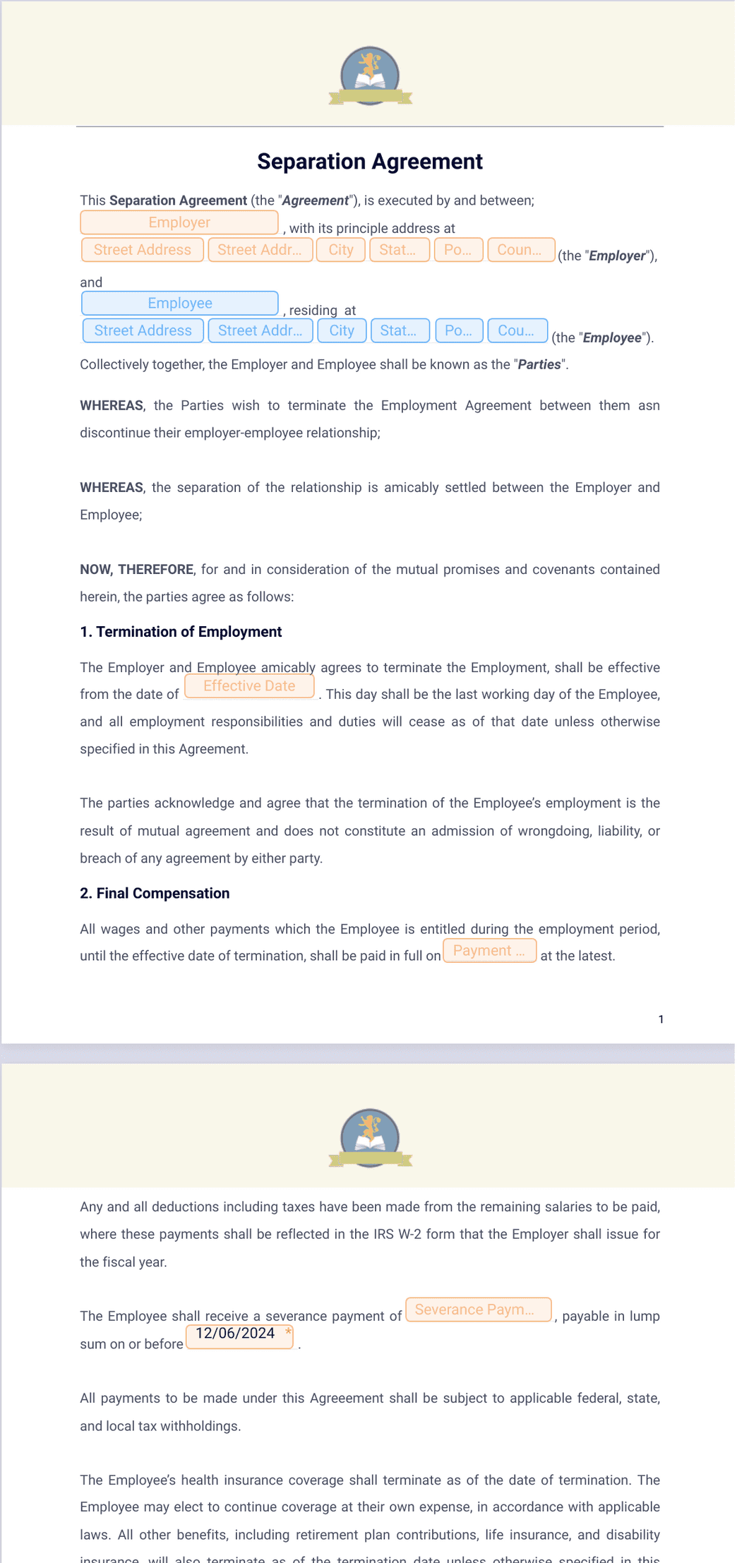 Terminate the professional relationship between an employee and their employer professionally with this Separation Agreement from Jotform Sign. Outline details of termination, compensation, final tasks, and more. Then just send it to your former employer or employee to collect electronic signatures. All involved parties will then receive a copy of your agreement for their records.