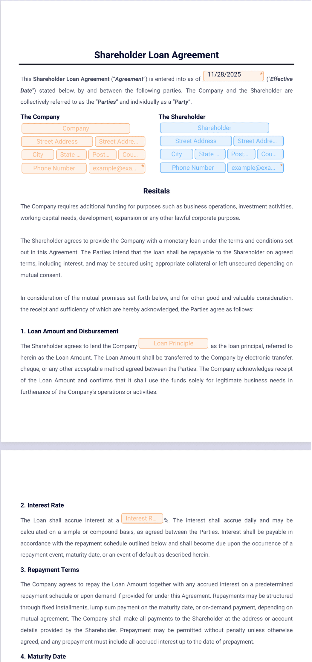 A Shareholder Loan Agreement is a formal document that outlines the terms and conditions of a loan from a shareholder to the company. This agreement details essential specifics like the loan amount, interest rate, repayment terms, default provisions, and the rights and obligations of both parties involved. This agreement can be particularly useful for company founders, existing shareholders, small and medium-sized business owners, corporate directors, startup teams, and private investors who are shareholders. With this agreement, businesses can secure internal funding, formalize financial support from shareholders, maintain clear financial records, and establish enforceable terms for shareholder-funded capital injections within a company.