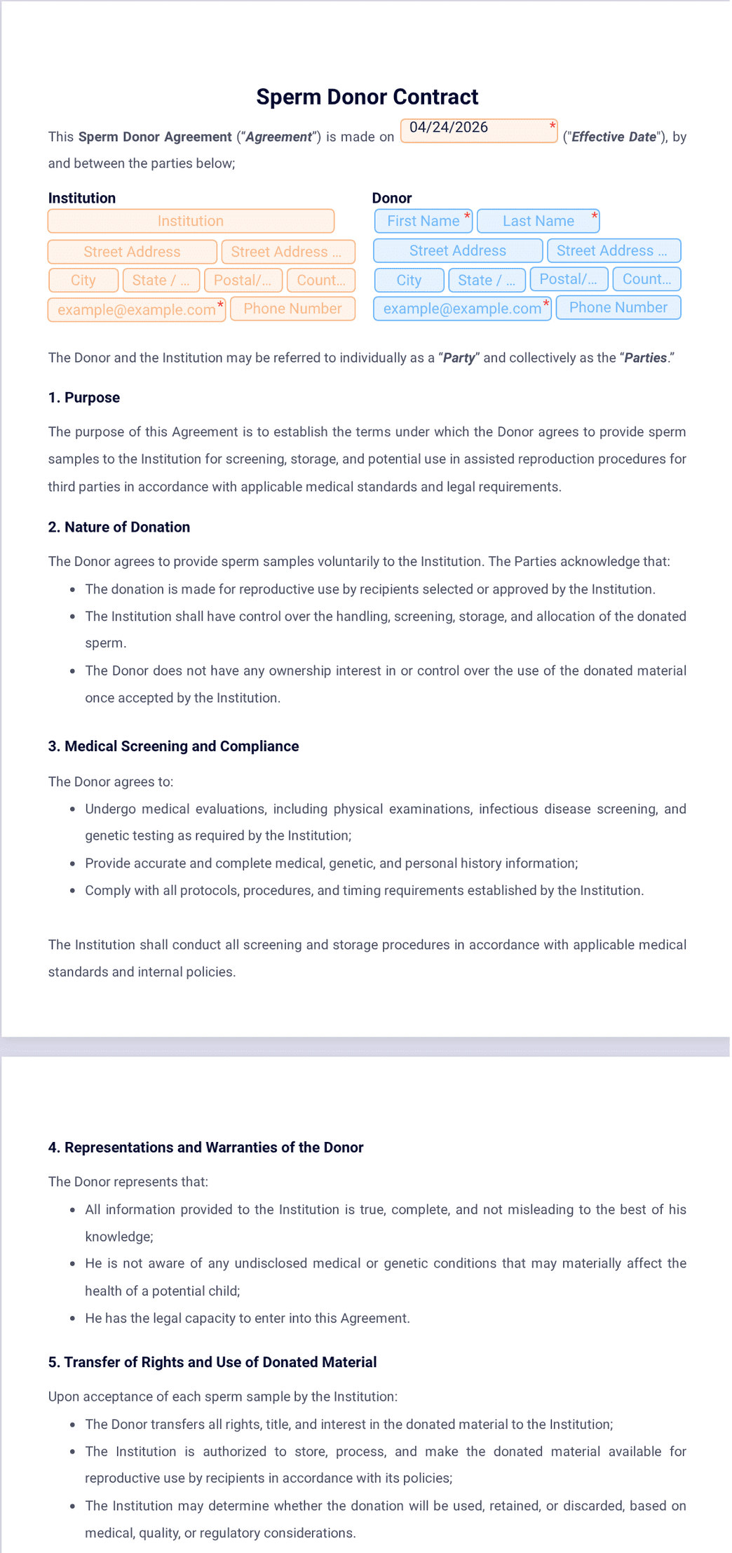 A Sperm Donor Contract is a document that outlines the rights, responsibilities, and obligations of all parties involved in a sperm donation arrangement. This contract is especially useful for individuals and fertility clinics that require a clear, concise agreement to ensure smooth cooperation and mutual understanding. Transparency about key details including the donor's identity, the donation process, and future contact terms are well defined in this document. The primary use case of a Sperm Donor Contract is to provide a foundation of understanding and agreement between the donor, recipient, and any other parties involved. It also helps avoid future disputes or misunderstandings by clearly laying out the terms of the donation.