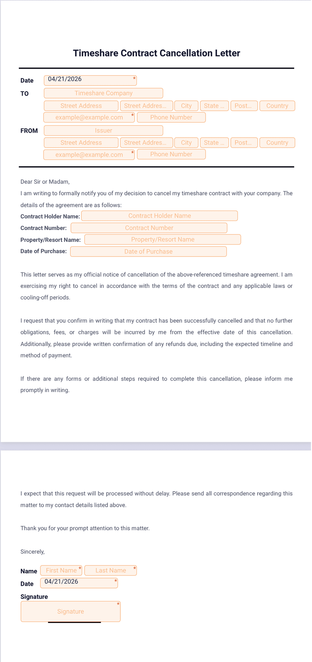 The Timeshare Contract Cancellation Letter Template is primarily used for signing timeshare cancellation letters. However, with customization, it can potentially be used for signing other related contracts or agreements.