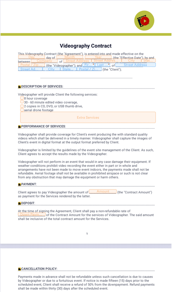 Quickly generate contracts for your videography services with this free online Videography Contract Template. Instead of drawing up each new contract by hand, Jotform Sign lets you customize this template to meet your needs and then send it to clients via email in a few easy clicks to be filled out and signed from any device.