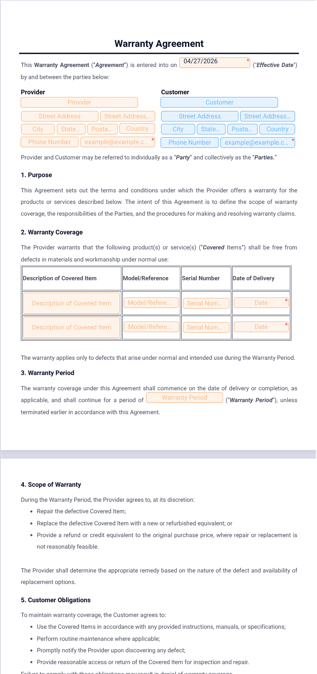 5) What are the key components that should be included in a warranty agreement template?