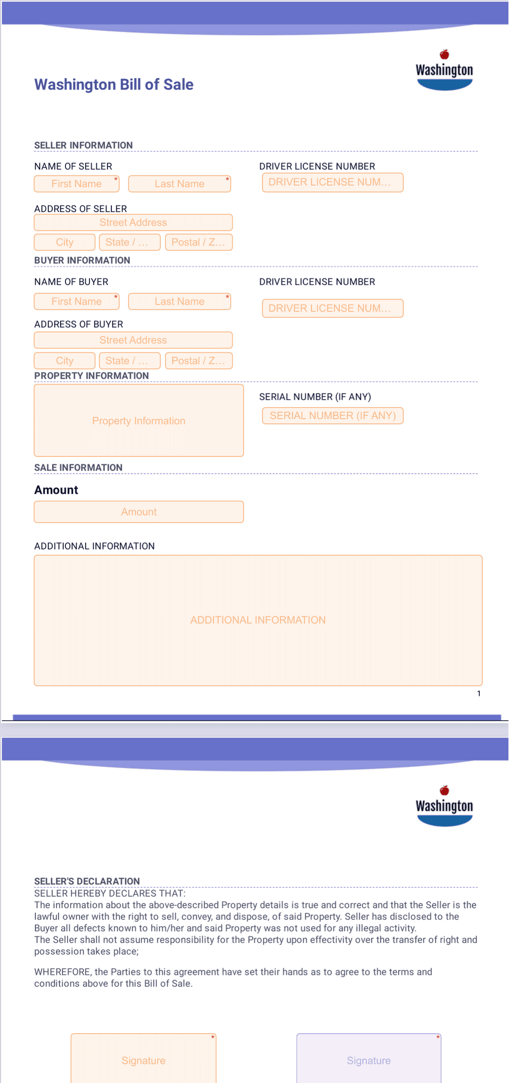 Work in Washington and want an efficient and professional way to document the goods you’re selling? Jotform Sign’s got you covered with this Washington Bill of Sale — works well for any seller, no matter the type of industry your business is in. With our entirely online signature collection process, you’ll be able to manage and reference signatures from your buyers in one convenient place. Embed in your online store for easy access.