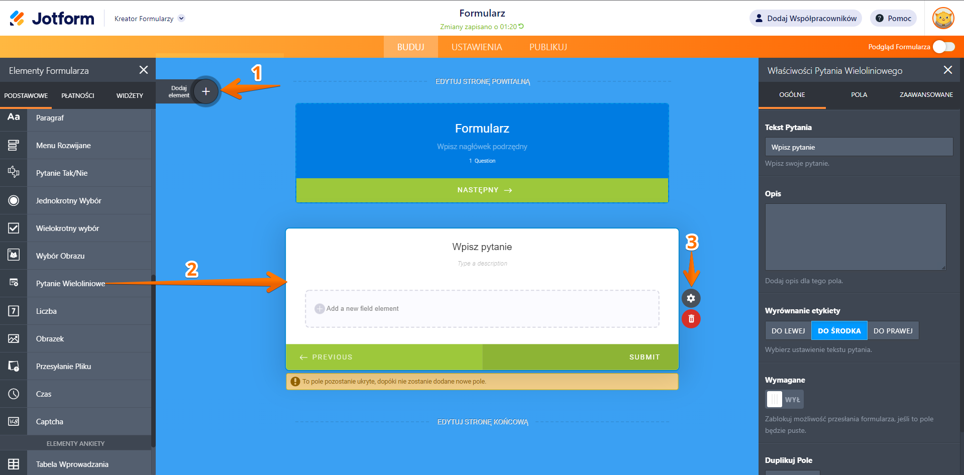 By dodać PYTANIE WIELOLNIOWE do formularza, kliknij przycisk DODAJ ELEMENT, przewiń do sekcji ELEMENTY PODSTAWOWE, a następnie przeciągnij i upuść pole do formularza. Kliknij ikonę ZĘBATKI, by otworzyć okno właściwości.
