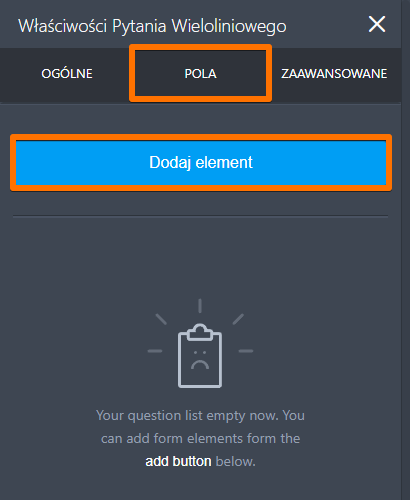 Po przejściu do właściwości, przejdź do zakładki POLA, kliknij przycisk DODAJ ELEMENT i dodaj potrzebne Ci pola.