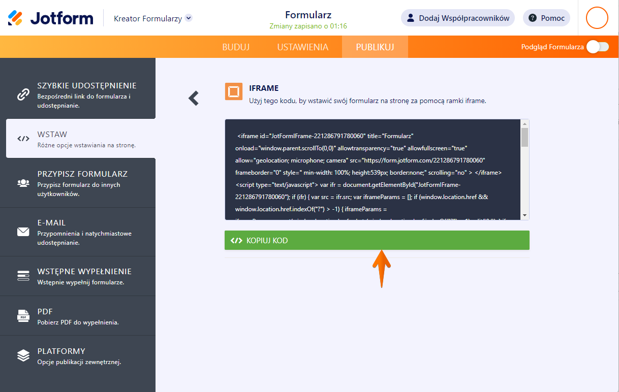 - Przejdź do zakładki Publikuj Kreatora Formularzy.