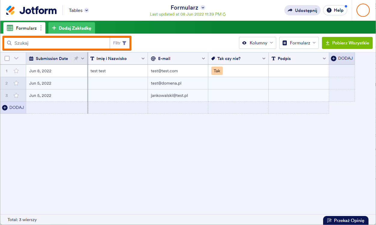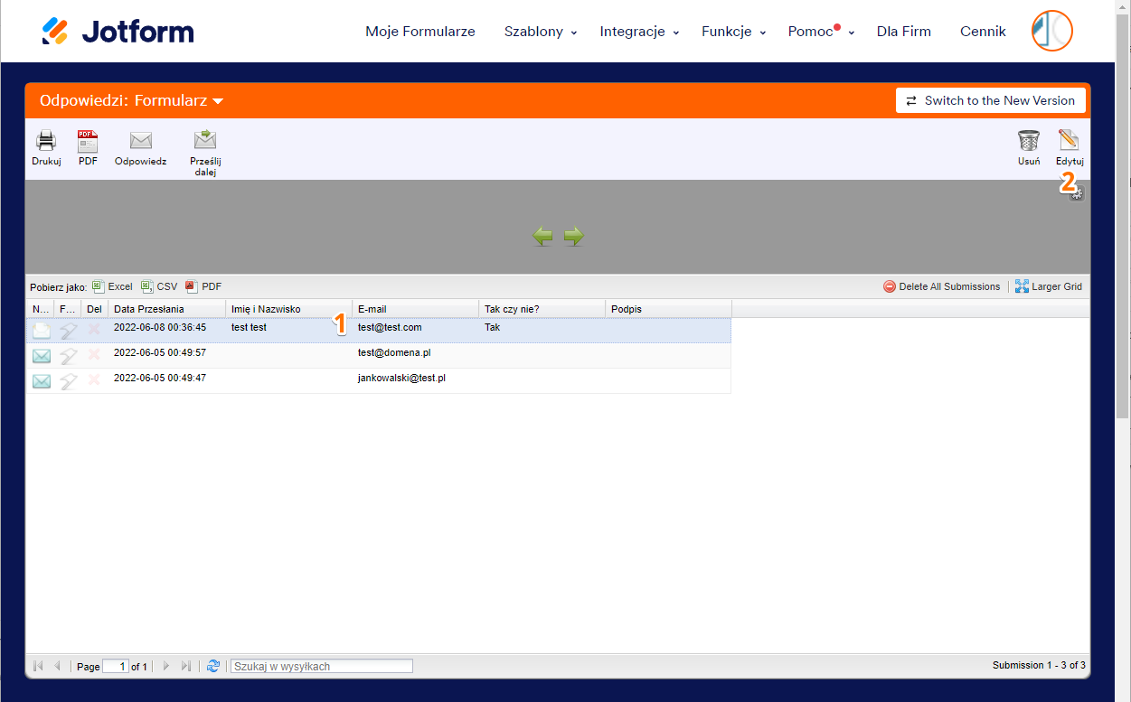 - Kliknij przycisk Odpowiedzi, by przejść do Tabeli Jotform.