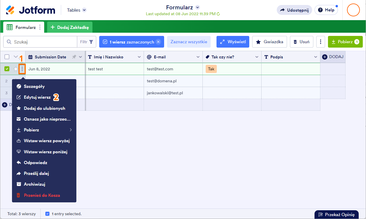 Edycja formularza tą metodą aktywuje skonfigurowane warunki i alerty e-mail. Tryb edycji załaduje formularz z danymi – możesz wprowadzić w nich zmiany i przesłać formularz ponownie.