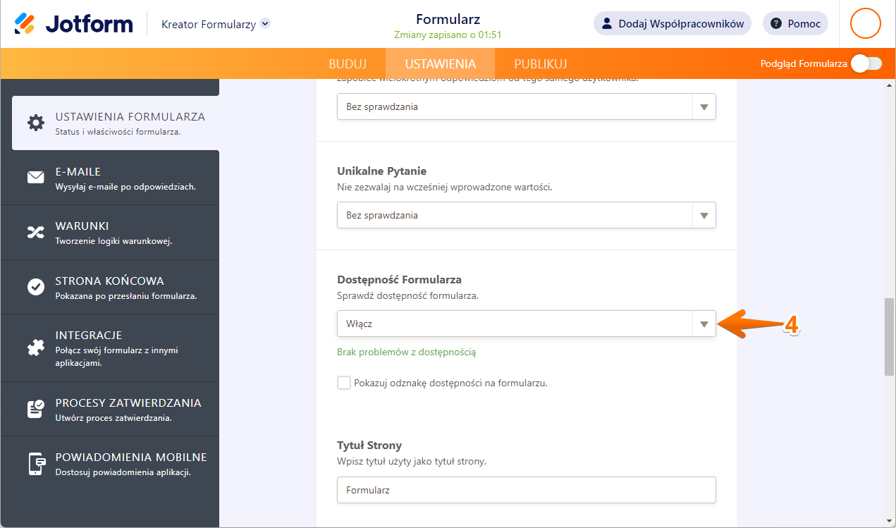 - Włącz opcję Dostępność Formularza.