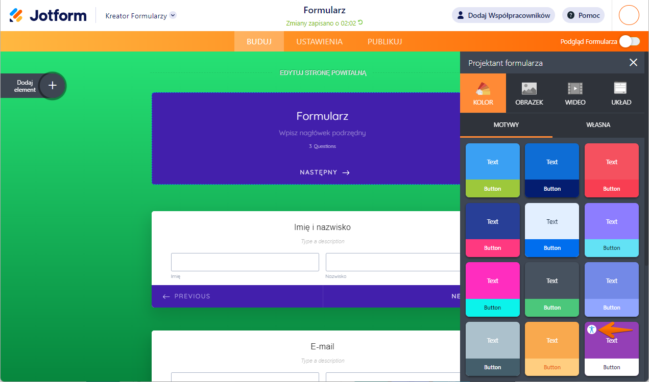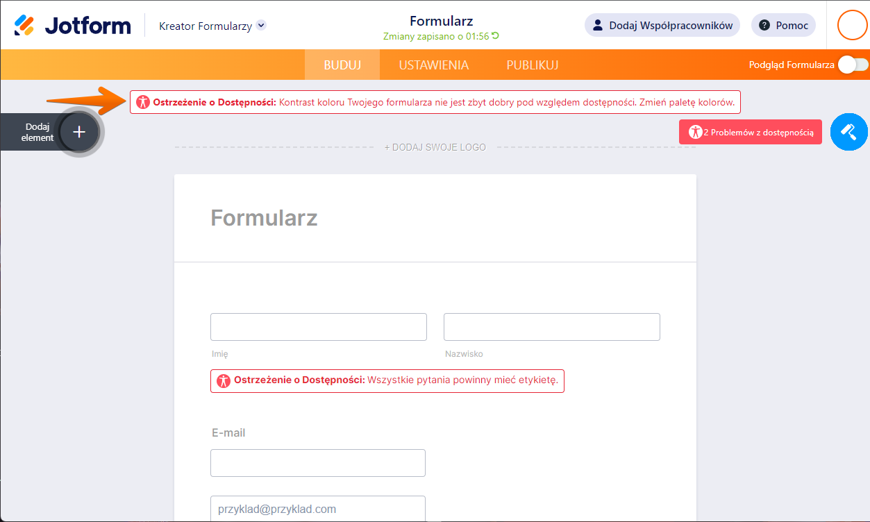 Nasz kreator przeanalizuje Twój formularz – jeśli wykryje problemy z dostępnością, otrzymasz ostrzeżenie wraz ze wskazówkami jak je naprawić. Na przykład, jeśli Twoja paleta barw jest zbyt mało kontrastująca, pole nie posiada etykiety, obrazek nie posiada tekstu alternatywnego, wykorzystany został niewspierany widget lub wykryte zostaną inne problemy, w Edytorze pojawi się odpowiedni błąd.