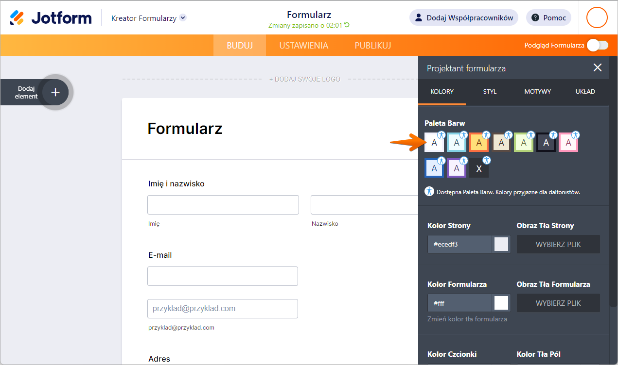 Oferujemy także gotowe, zgodne z zasadami dostępności palety barw dla formularzy klasycznych i karcianych. Palety te zostały zaprojektowane z myślą o dostępności – możesz je rozpoznać po małej ikonce ludzika.