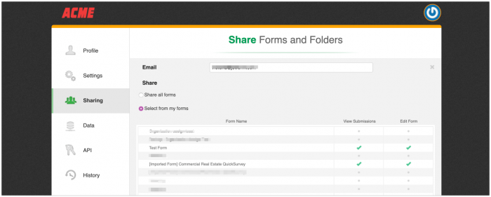 Po wybraniu opcji ‘Select from my forms’, zobaczysz tabelę pozwalającą na nadanie uprawnień: